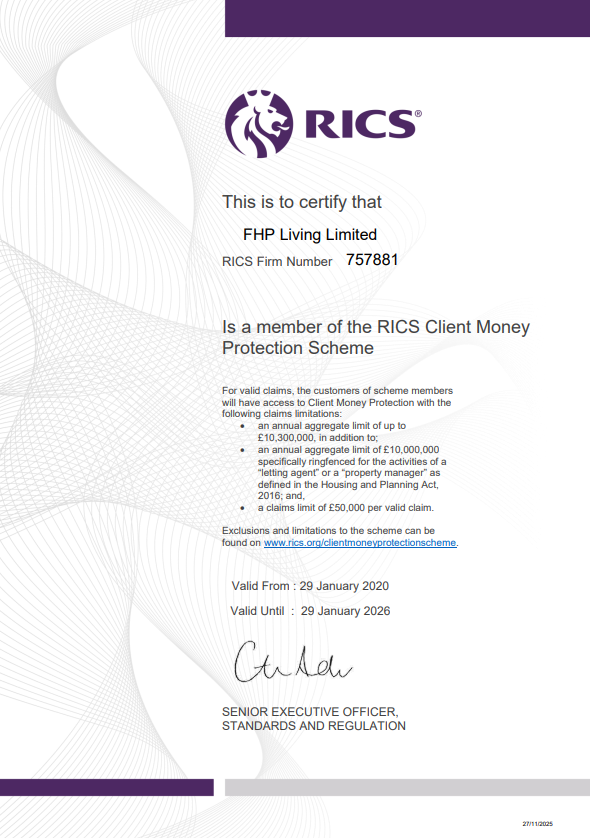 FHP Living follows RICS mandatory and best practice guidelines as set out in RICS, Client Money Handling, effective from 1 Jan 2020.