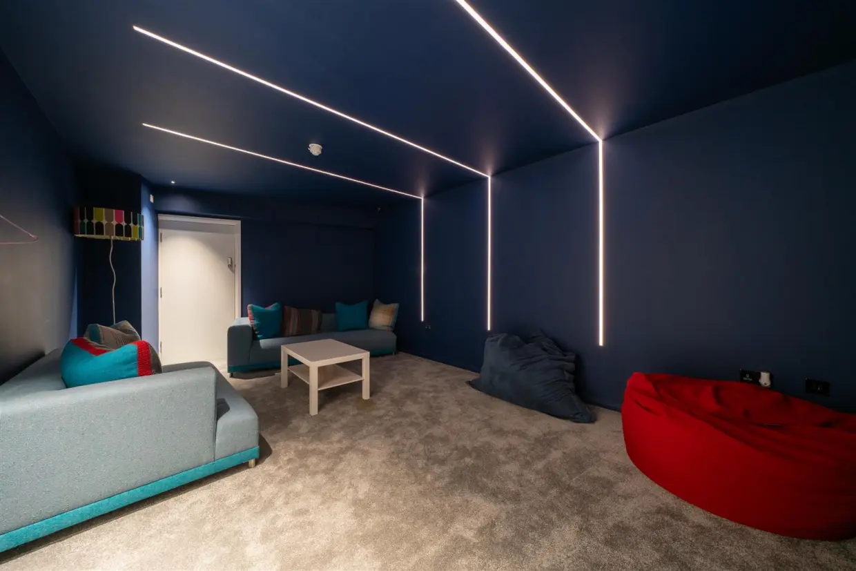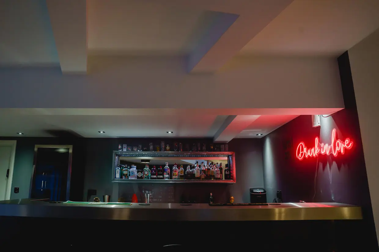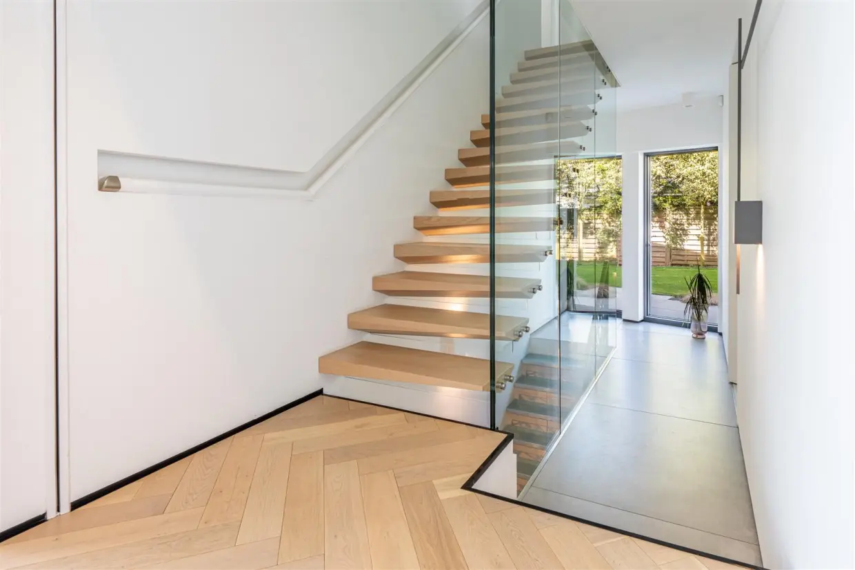 A suspended wood and glass staircase leads upstairs, while a metal and glass staircase takes you to the lower ground floor-a dedicated leisure and entertainment zone.