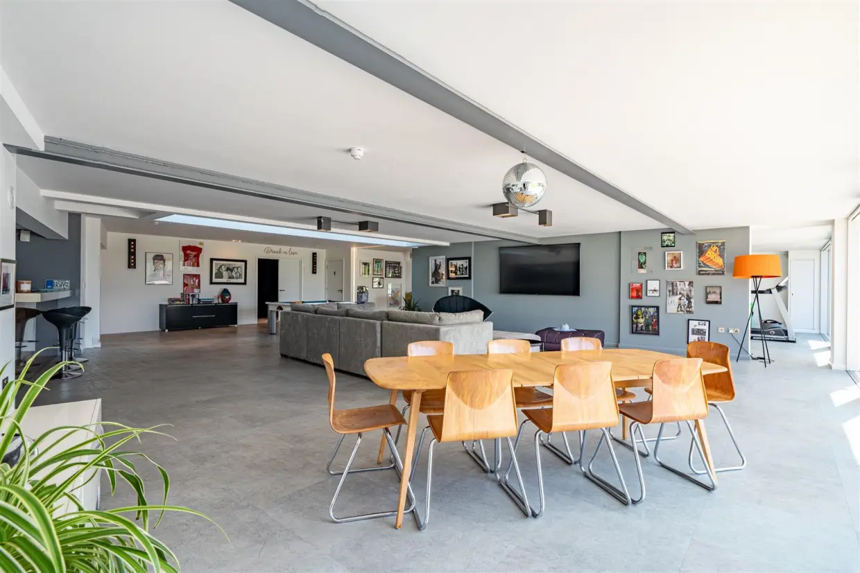 The heart of the property is an expansive open-plan kitchen, dining, and living area filled with natural light. The bespoke German kitchen includes a breakfast larder with concealed doors, Gaggenau appliances, Bora hob, Liebherr fridges and dishwasher, Boiling tap, and an additional pantry room with additional appliances. Full-height sliding doors open onto a large balcony, blurring the line between indoor and outdoor living. Large sound speakers are hidden within the walls.