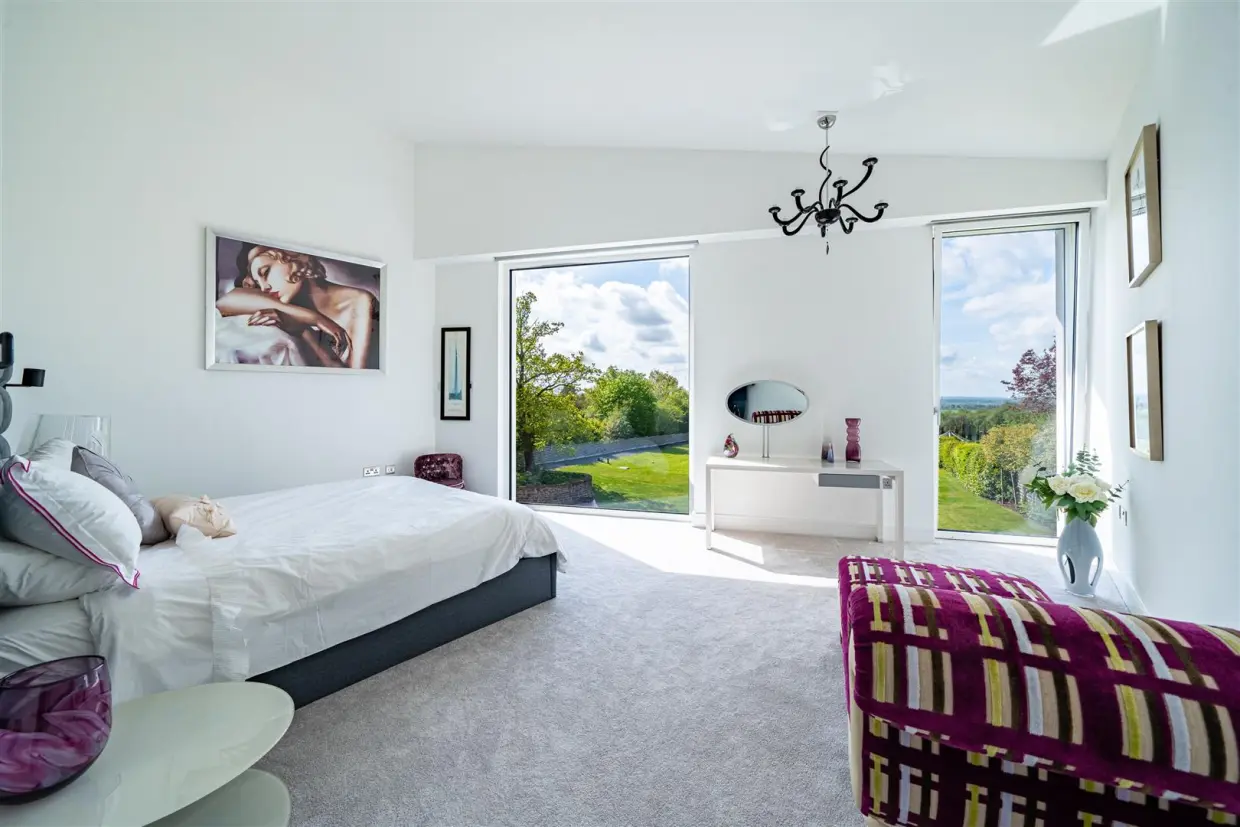 Upstairs, a galleried mezzanine connects five spacious bedrooms. The luxurious principal suite offers dual-aspect views, high ceilings, a bespoke walk-in dressing room, and a spa-like en-suite with Hansgrohe rainfall shower and Corian double sink. The remaining bedrooms match in quality, with high spec en-suites and fantastic views.