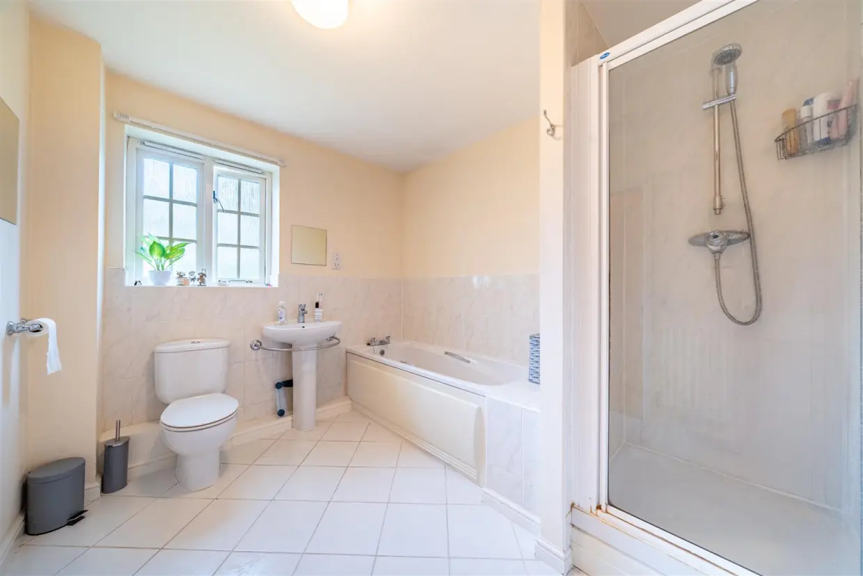 The stylish four-piece bathroom suite can also be accessed via the hallway, featuring a bath and separate shower cubicle.