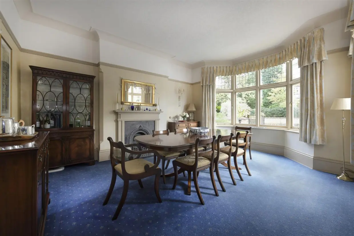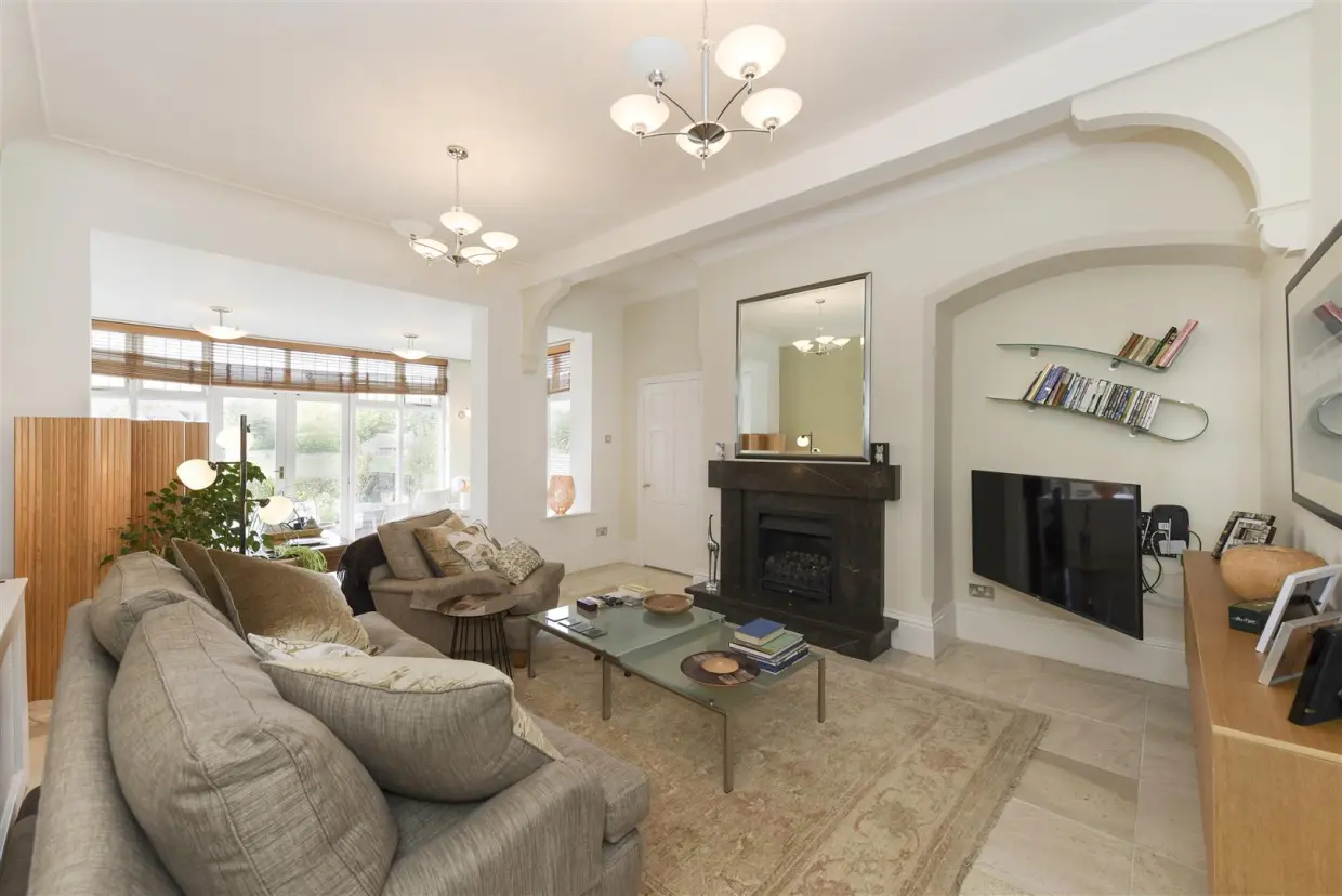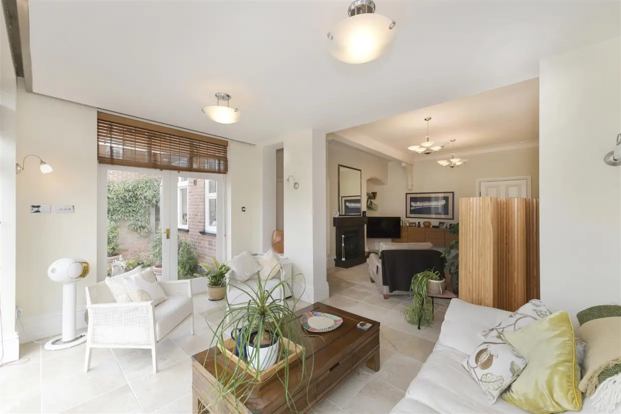 The formal dining room sits at the front of the house, enjoying a large bay window that floods the space with natural light and showcases a second decorative fireplace. To the rear, the elegant living room also boasts a charming feature fireplace and opens into a bright and airy garden room. With French doors leading directly to the rear garden, this space makes an ideal retreat for relaxing or entertaining.
