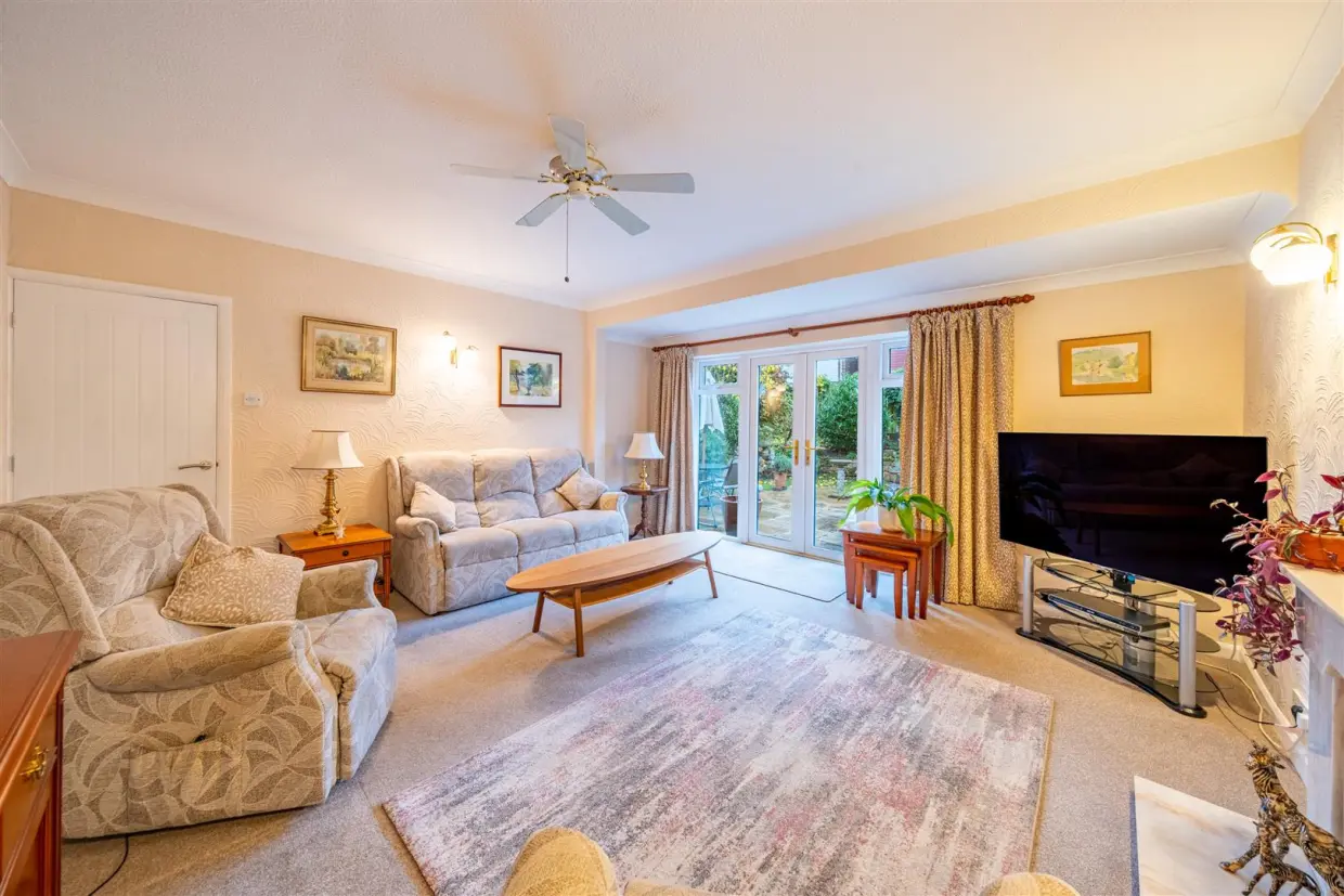 The generous lounge enjoys views over the private rear garden through French doors that open out onto the patio. The room also features a fireplace with a gas living-flame fire.