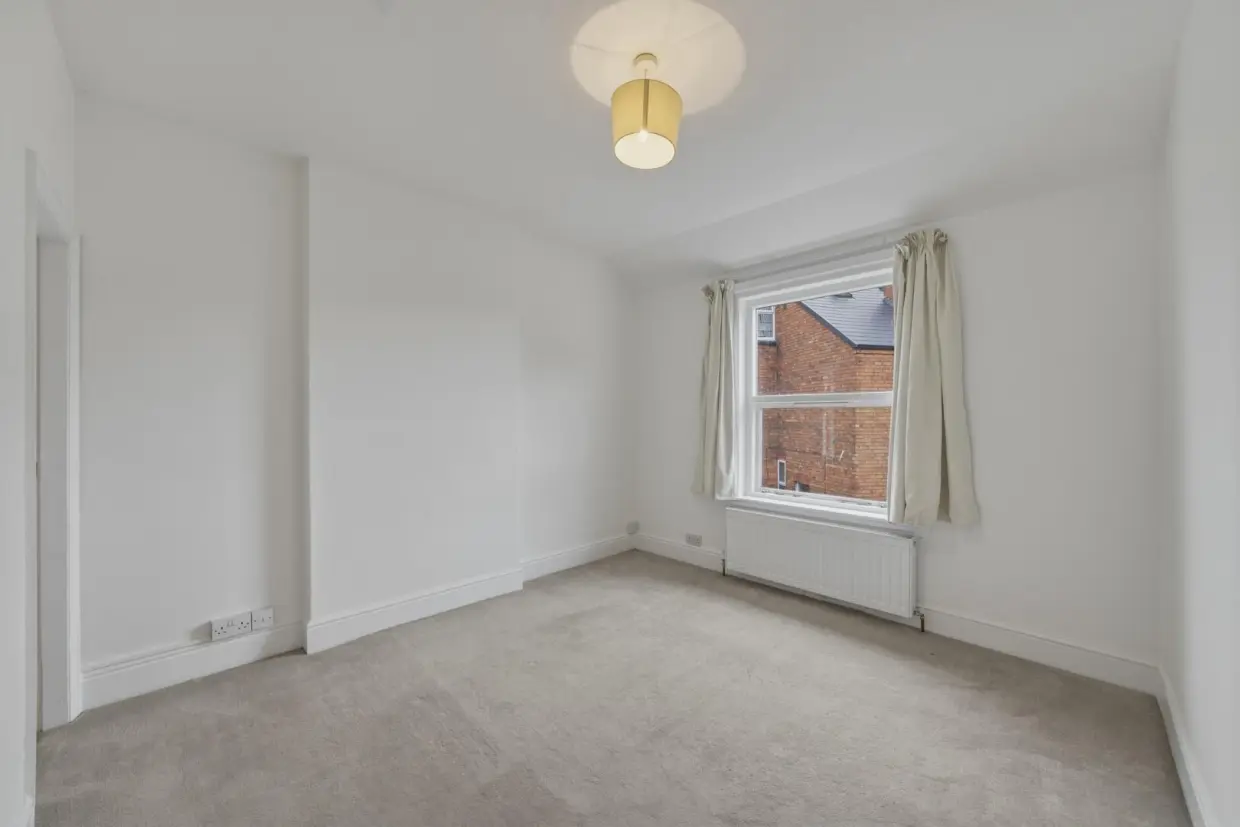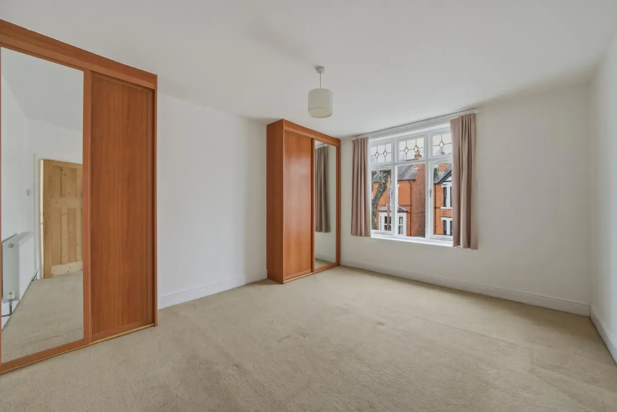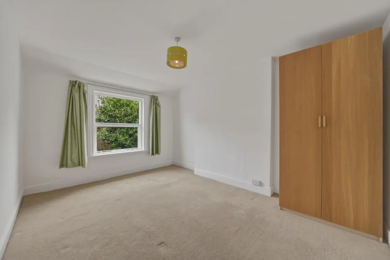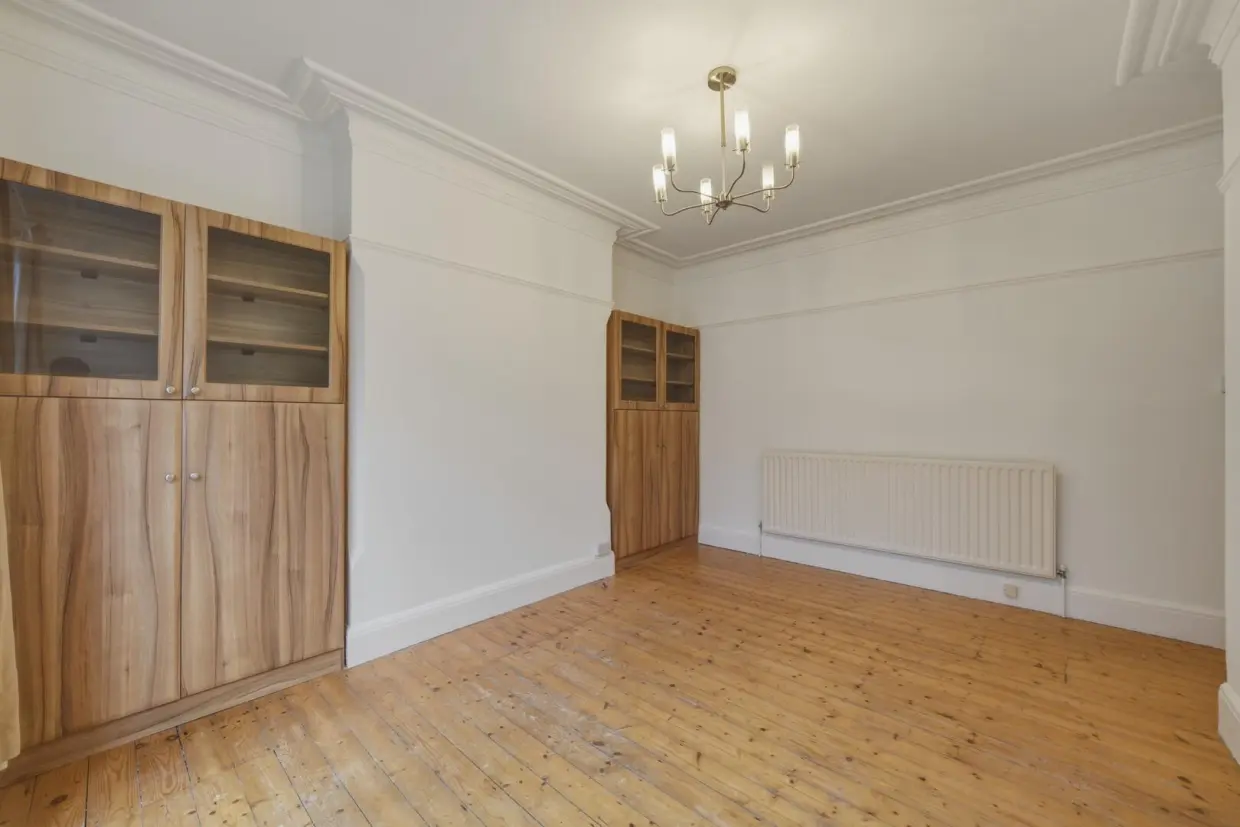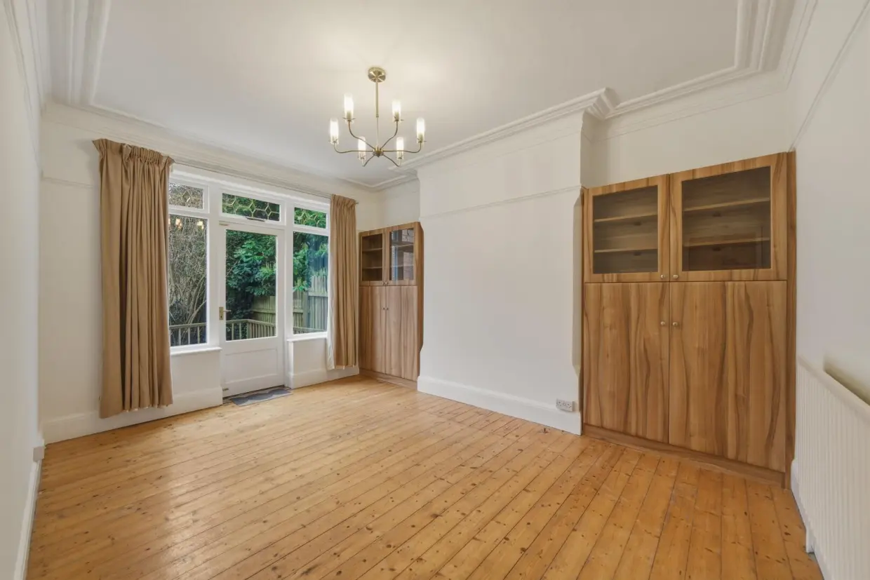 To the rear of the property, the second reception room continues the attractive stripped wooden flooring and benefits from built-in cabinetry to either side of the chimney breast, which offers potential for an open fire or log burner. Original coving adds further character, while French doors with side lights open directly onto the decked terrace and rear garden, creating an ideal space for both everyday living and entertaining.