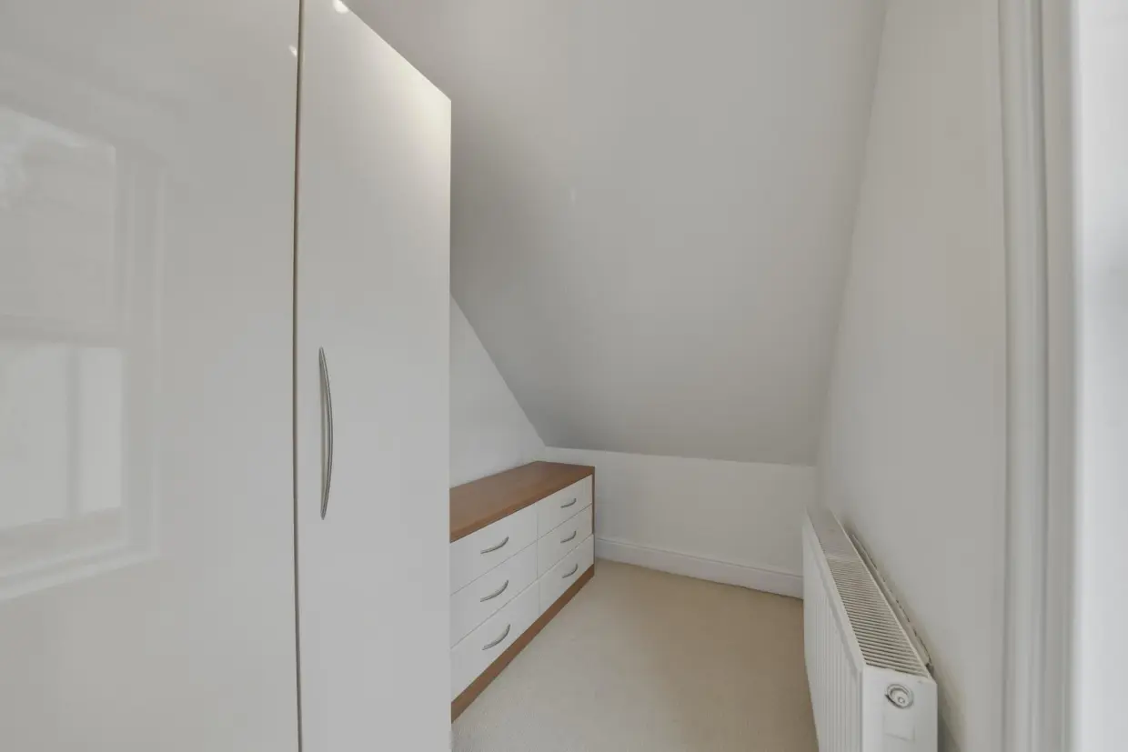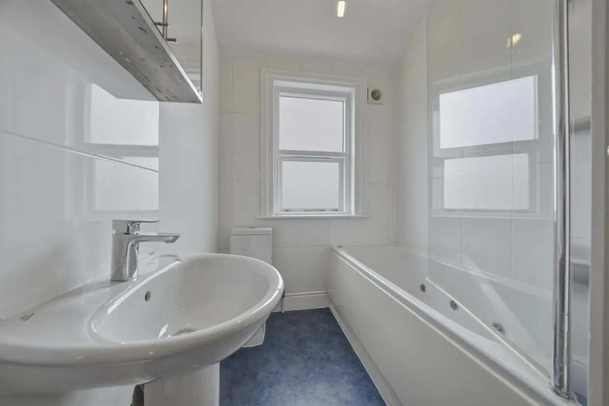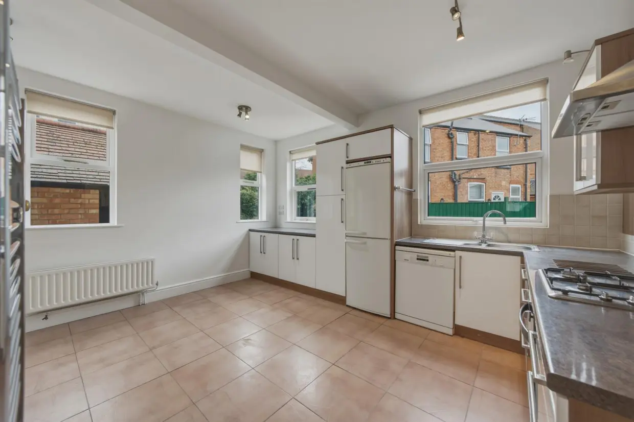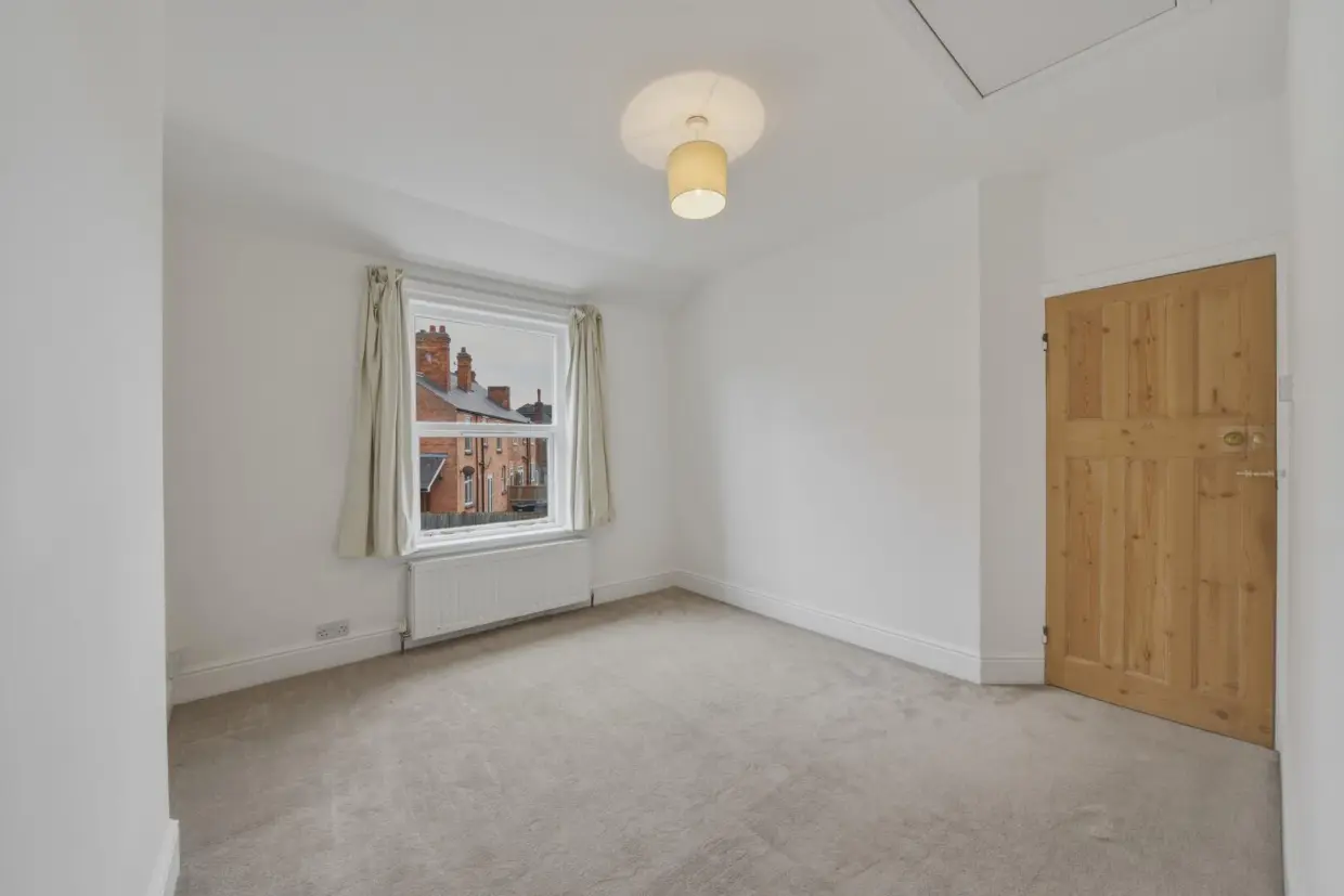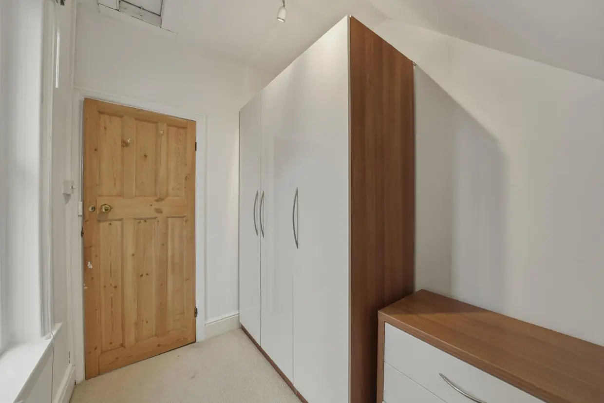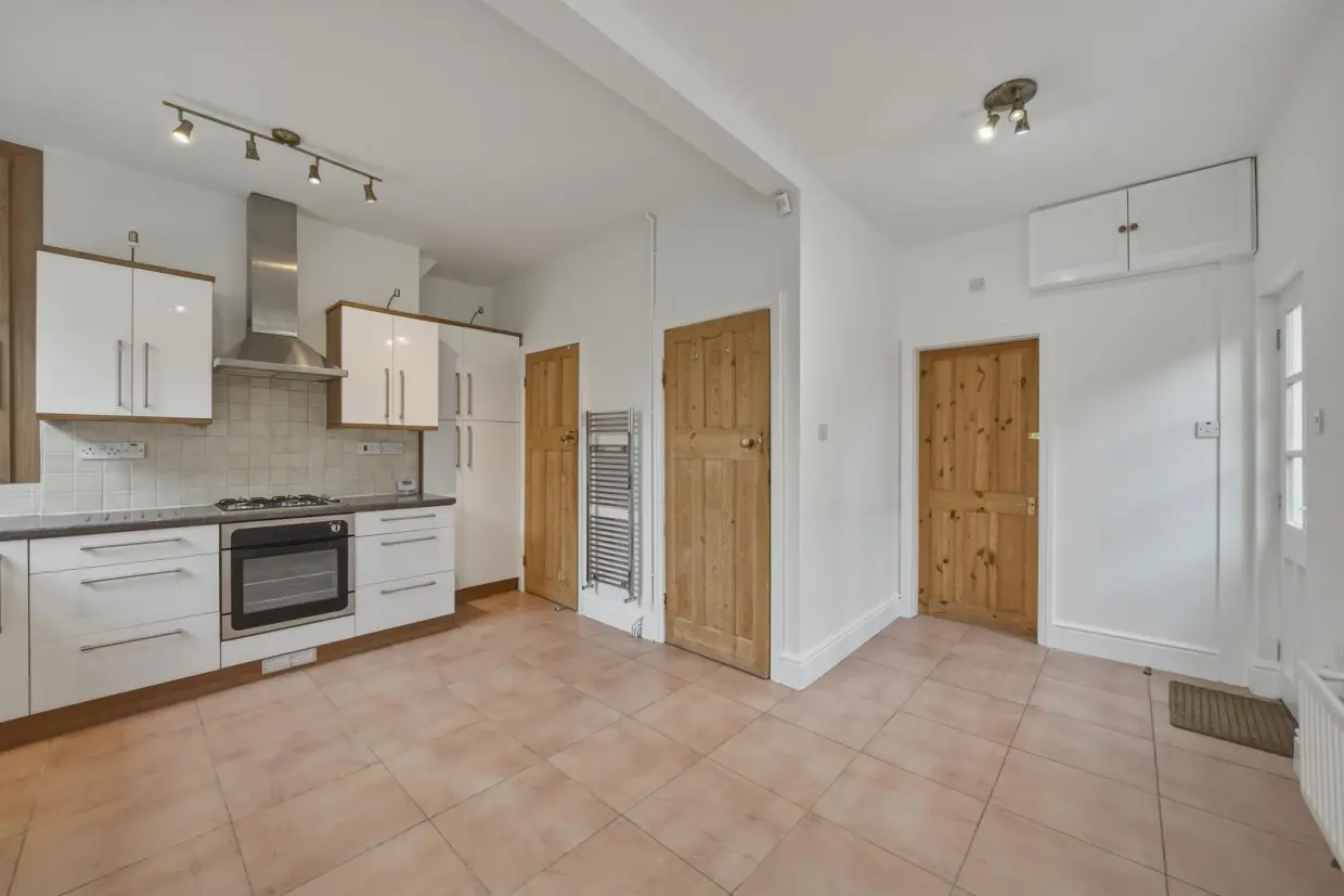 To the rear of the property, the second reception room continues the attractive stripped wooden flooring and benefits from built-in cabinetry to either side of the chimney breast, which offers potential for an open fire or log burner. Original coving adds further character, while French doors with side lights open directly onto the decked terrace and rear garden, creating an ideal space for both everyday living and entertaining.