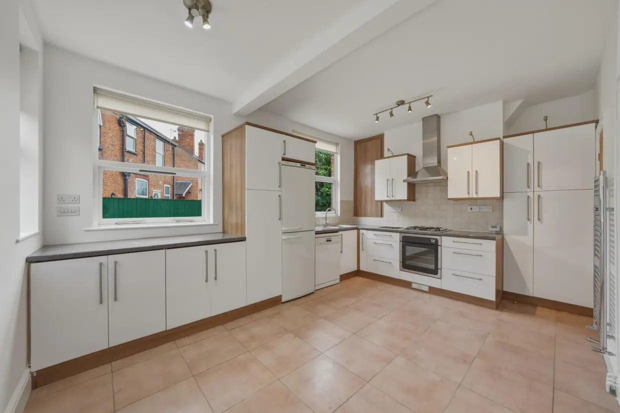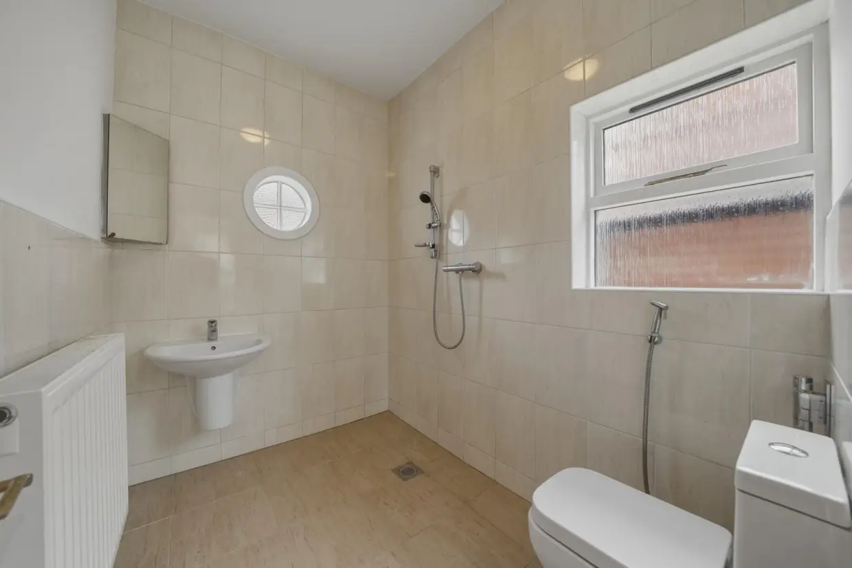 The breakfast kitchen is fitted with a range of wall and base units with integrated appliances and enjoys a dual-aspect outlook with windows to the side and rear. The room is finished with ceramic tiled flooring and provides access to a ground floor wet room fitted with a sink, toilet and walk-in shower.