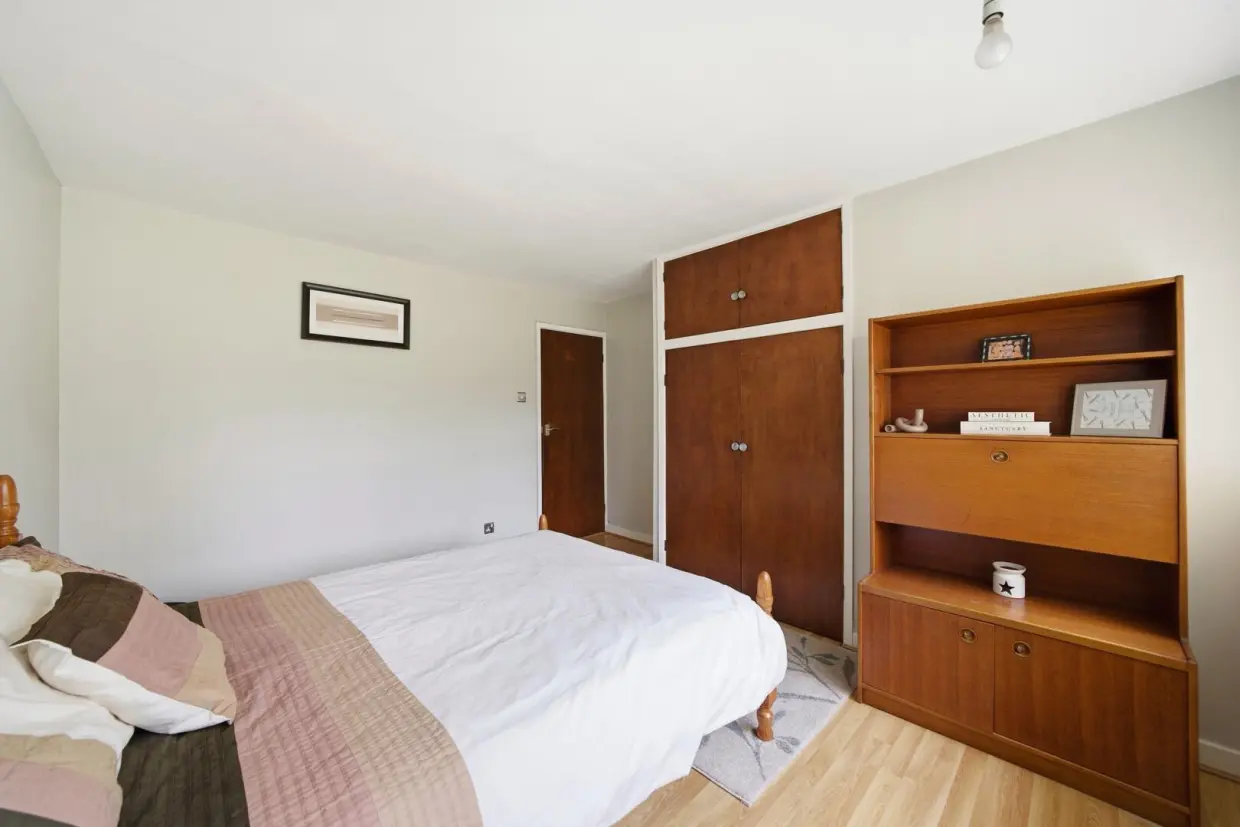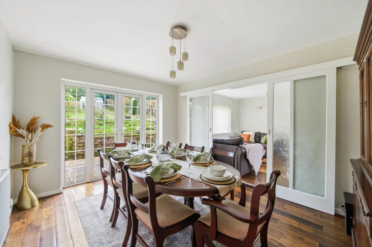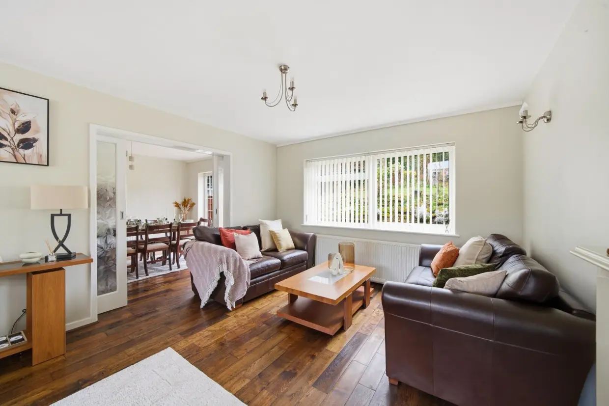 The spacious lounge benefits from both front and rear windows, allowing an abundance of natural light to flow through. It features wooden flooring and a characterful fireplace with gas fire. Opaque glazed doors lead through to a separate dining room, where the flooring continues seamlessly and a serving hatch connects to the kitchen.
