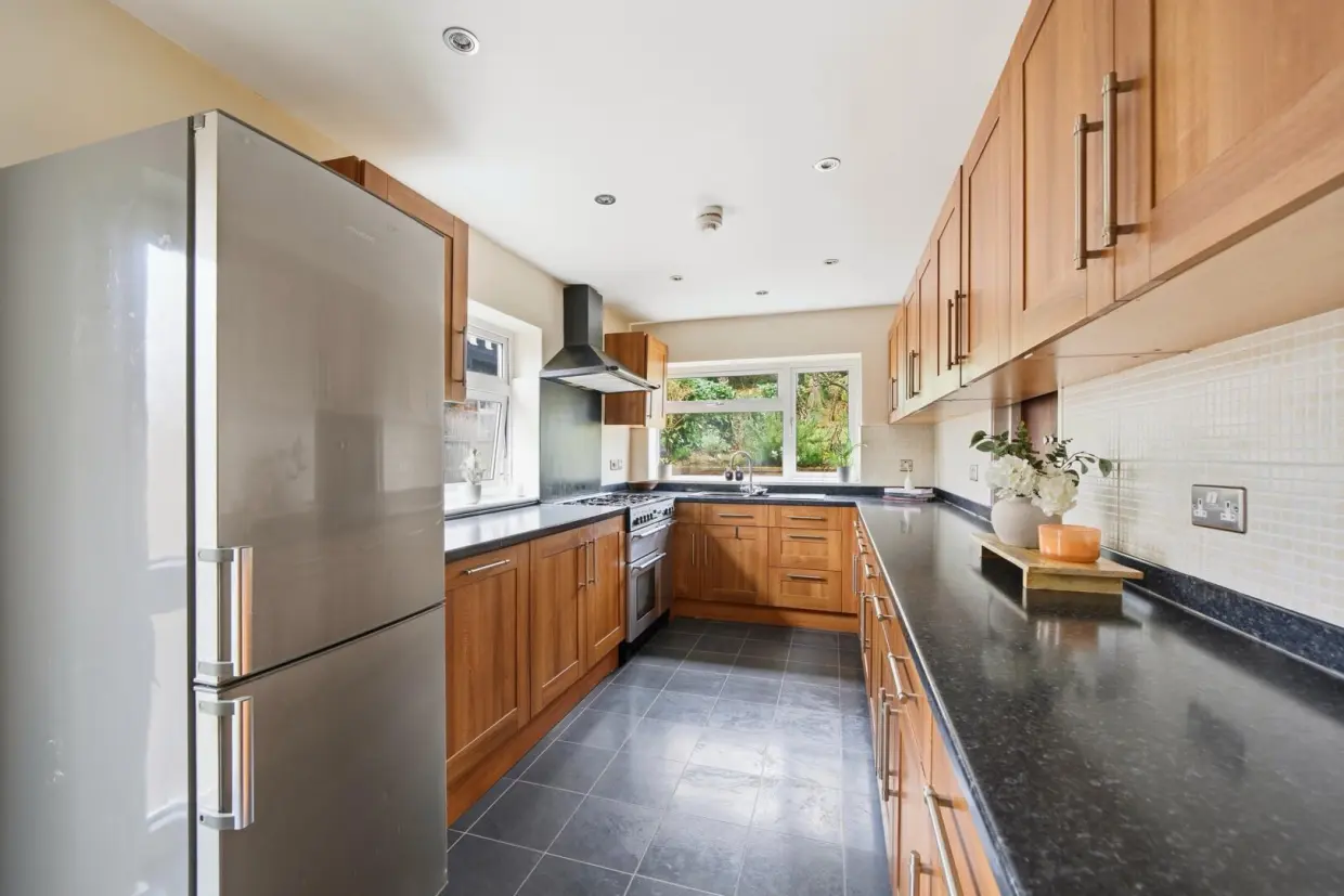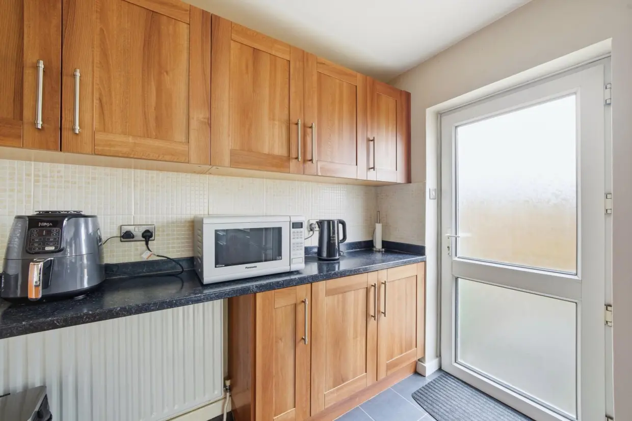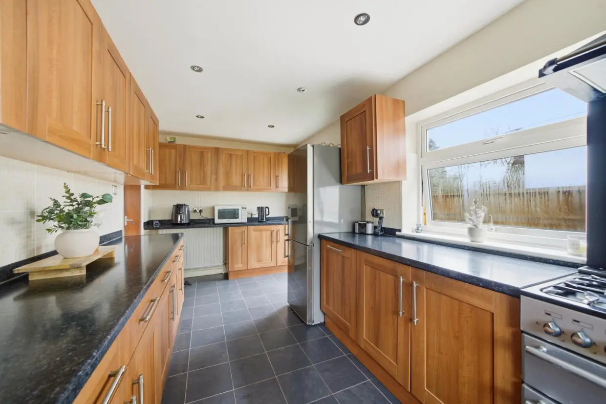 The kitchen is well-appointed and fitted with a range of modern units and appliances, enjoying a side access door.