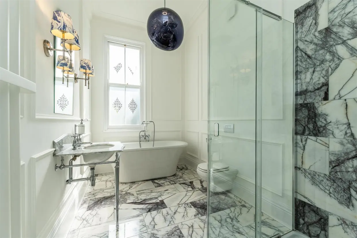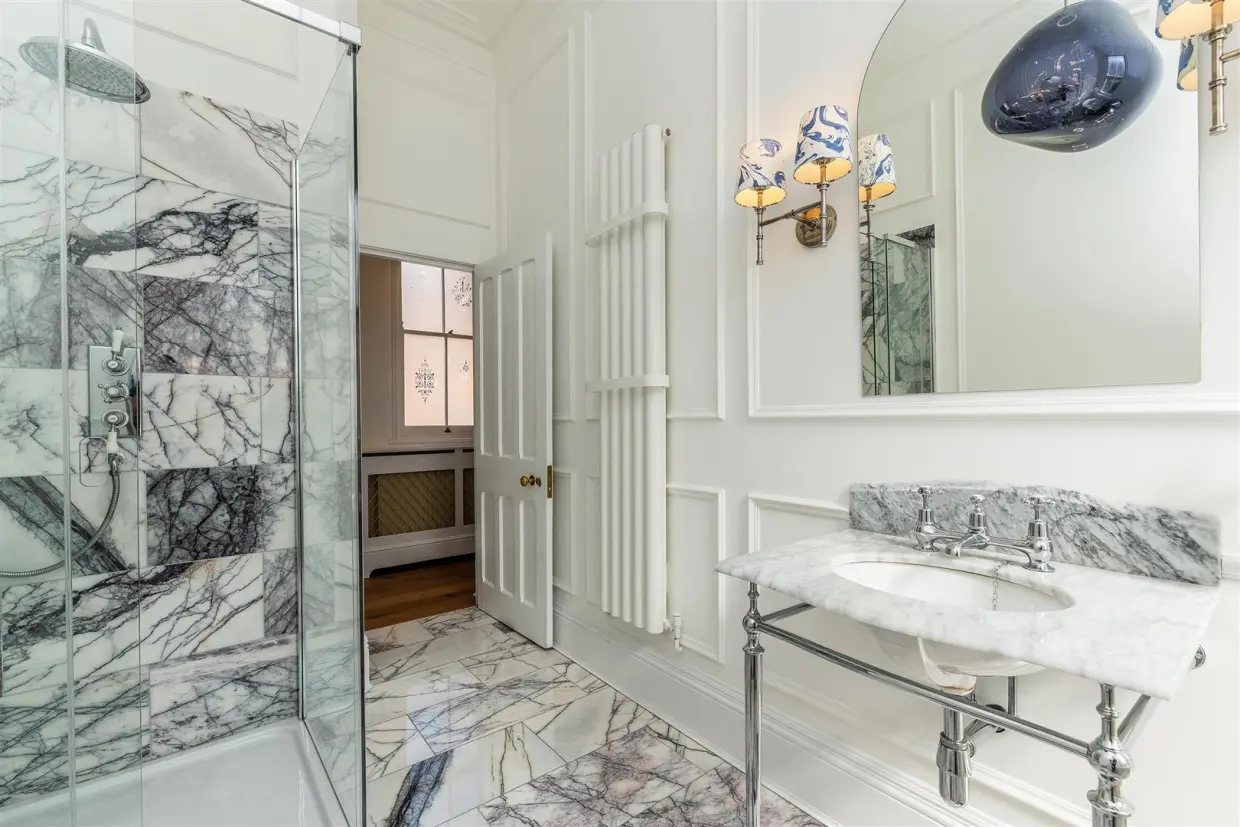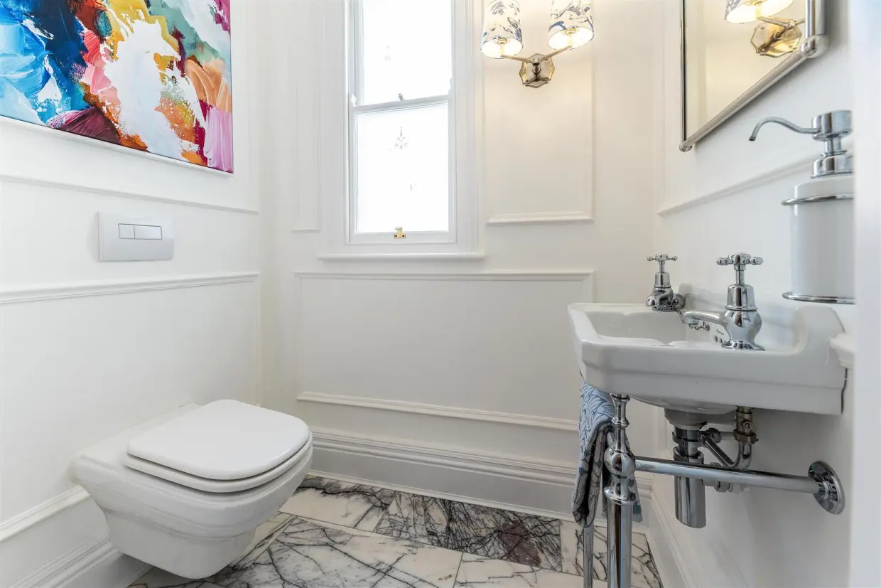 Every detail of Elmhurst's restoration honours its historic roots. Original pitch pine sash windows have been expertly restored and fitted with heritage, hand-engraved glass, while bespoke oak flooring runs throughout most of the home. The bathroom and Cloaks/WC boast Carrara marble flooring and custom panelling complementing the thoughtful restoration of skirting boards, fireplaces, and decorative plasterwork, including ceiling roses in most rooms.