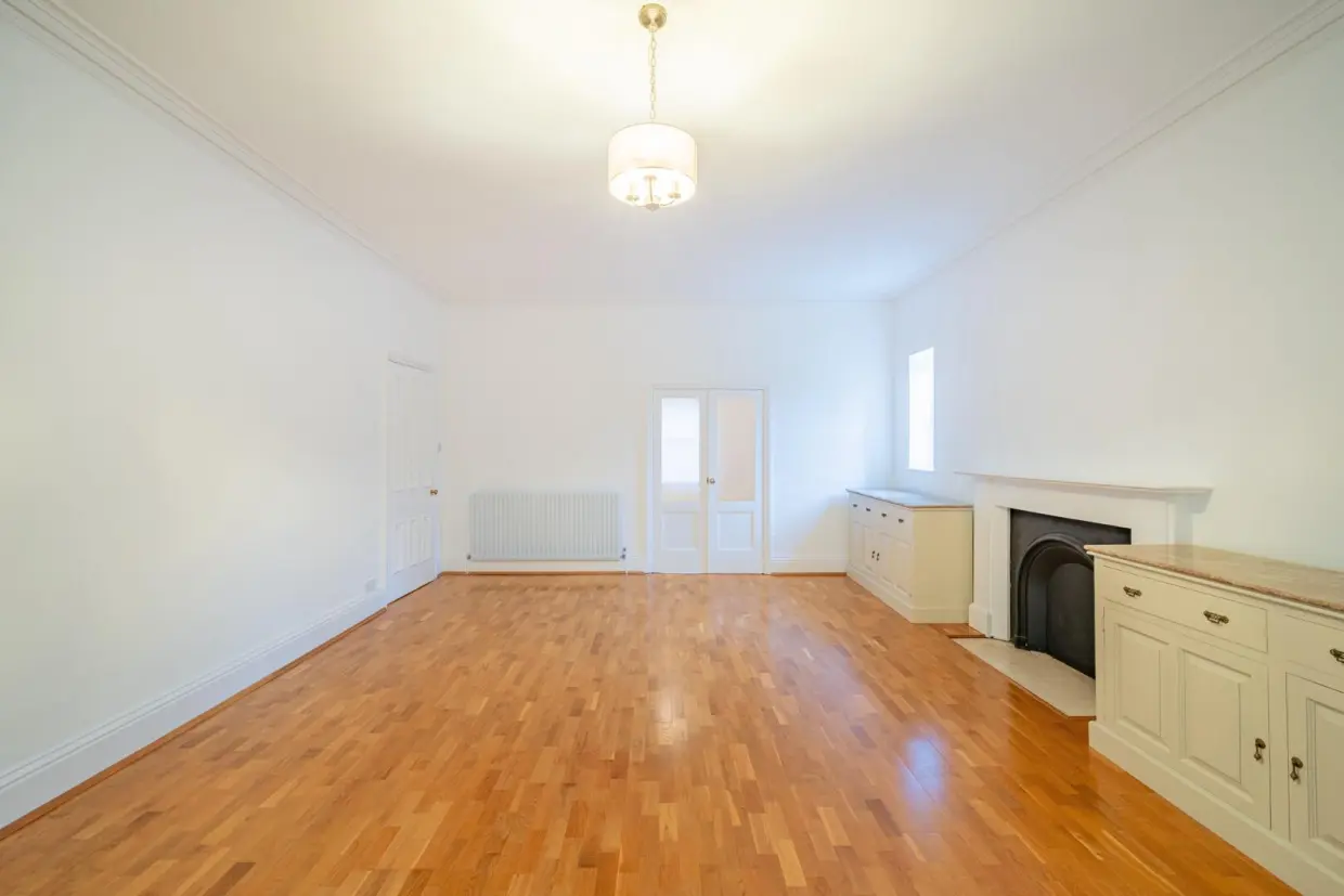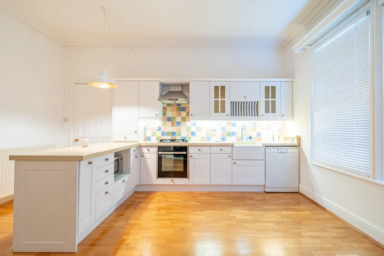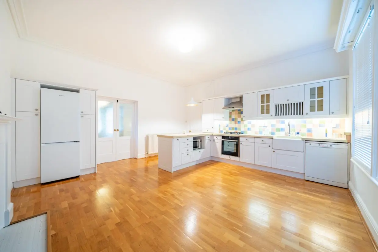 The formal dining room is a superb statement space with tall ceiling, an impressive bay window framing views over The historic Park estate, an ornate period fireplace and ceiling cornicing — ideal for elegant entertaining. Adjacent, the dining kitchen is both classical and practical, fitted with cabinetry, attractive worktops, a Belfast sink, integrated appliances and a charming period ornamental fireplace framed by original ceiling cornicing making it perfect for everyday living and social gatherings alike.