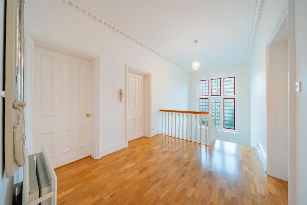 From the moment you enter, the private entrance hall sets an impressive tone, featuring original Minton tiled flooring, useful under-stairs storage/utility space, and a traditional staircase enhanced by a striking stained-glass window. The first-floor landing is laid with rich engineered wood flooring and filled with natural light, creating an immediate sense of warmth and openness.