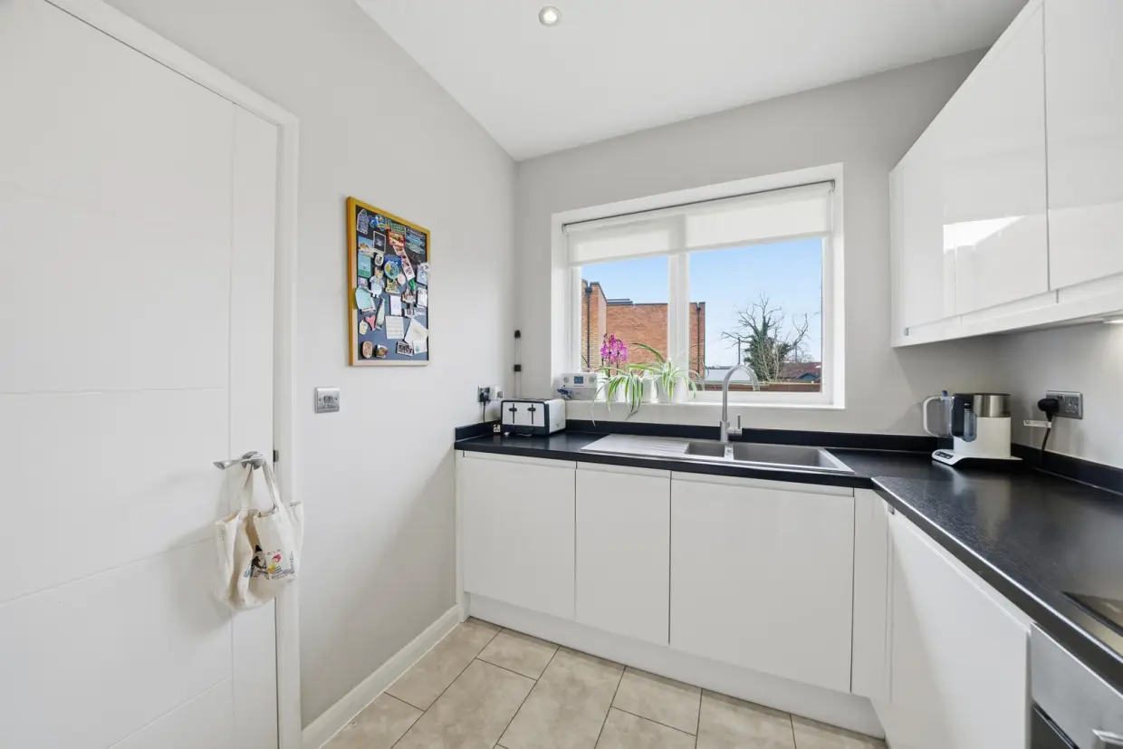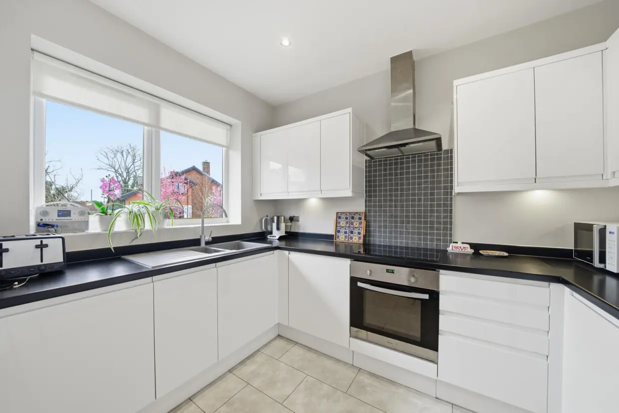 The kitchen is fitted with a modern range of high-gloss wall and base units with a composite sink unit and a selection of integrated appliances, including an induction hob, dishwasher, and fridge freezer. The room is finished with LVT flooring.