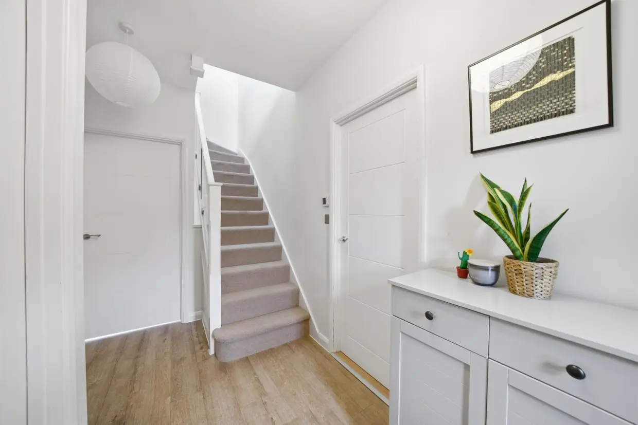 The property is entered via a composite front door which opens into a welcoming reception hall, featuring wood-effect composite flooring with underfloor heating. Stairs rise to the first floor and there is access to a downstairs WC, fitted with a contemporary two-piece suite, tiled flooring and walls, also benefiting from underfloor heating.The main living area is a light and spacious room with patio doors opening onto the rear terrace. The wood-effect flooring continues throughout this space and is complemented by underfloor heating. There is also a useful under-stairs storage cupboard.