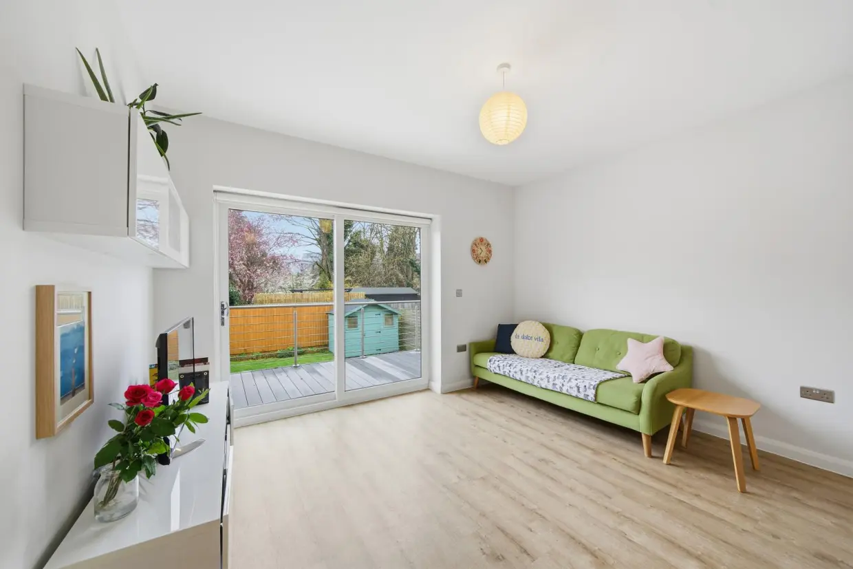 A second reception room features wood-effect flooring and patio doors leading out onto the rear decked area, creating an ideal space for entertaining or relaxing.