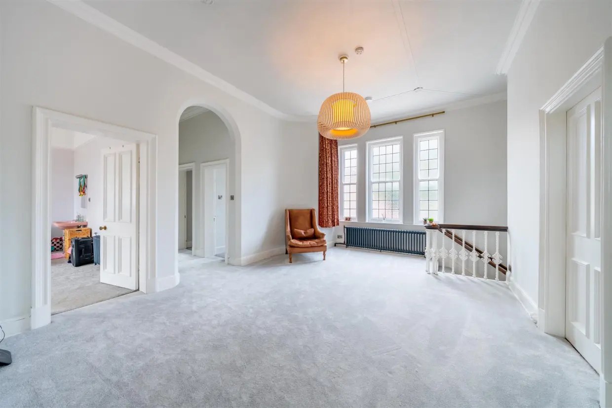 A spacious landing, illuminated by a large feature window, leads to four well-proportioned double bedrooms. The principal suite is a true sanctuary featuring a luxurious en-suite bathroom with a roll-top bath and separate shower, evoking classic elegance and relaxation. The remaining bedrooms on this floor are equally impressive, each boasting generous proportions and characterful detail.