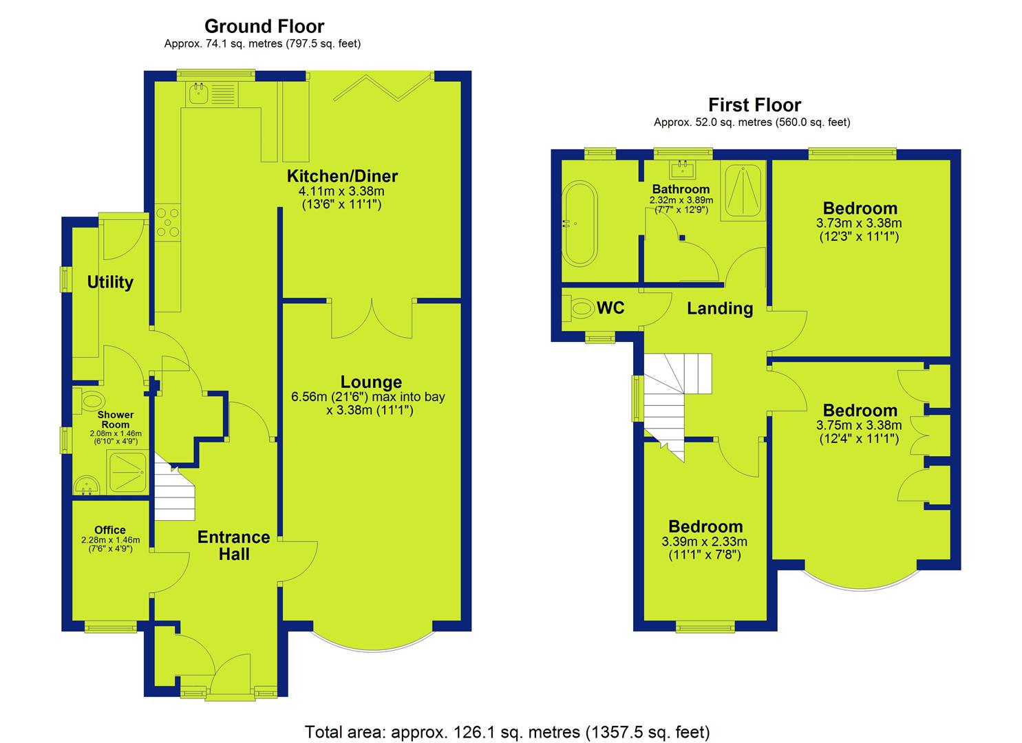 The extended family bathroom is beautifully appointed with a stylish contemporary three-piece suite, comprising a double walk-in shower cubicle, vanity wash hand basin, and freestanding bath, finished with elegant flooring and dual double-glazed windows to the elevation. A separate WC completes the first floor.