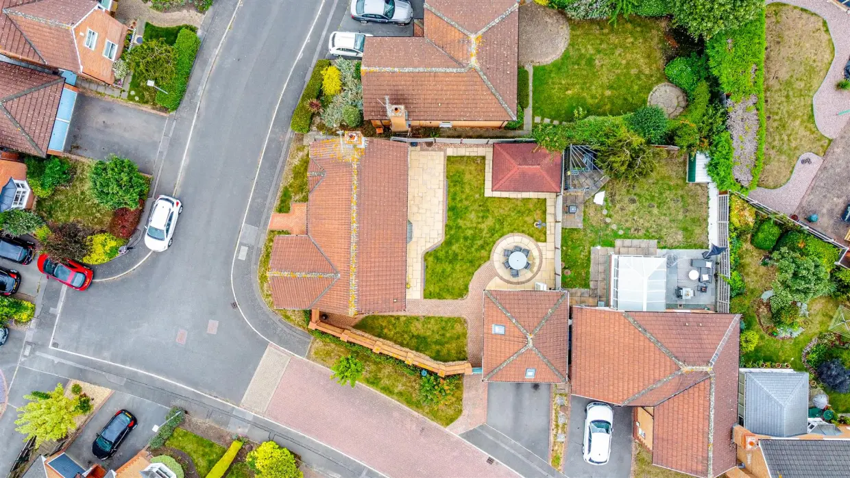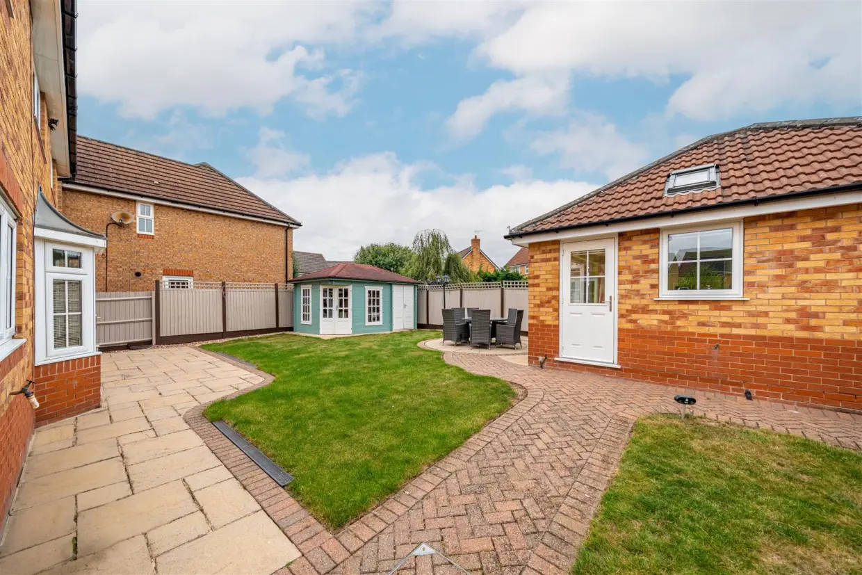 Outside, the home continues to impress. A lawned garden with a paved pathway enhances the front approach, with the lawn sweeping around to the side and enclosed by a brick-built boundary wall. A tarmac driveway provides off-road parking and access to the detached annex, currently utilised as a gym. Gated access to the rear reveals a private garden with a full-width patio, additional seating area, well-kept lawn, and a timber outbuilding complete with power and lighting, making it as functional as it is inviting.