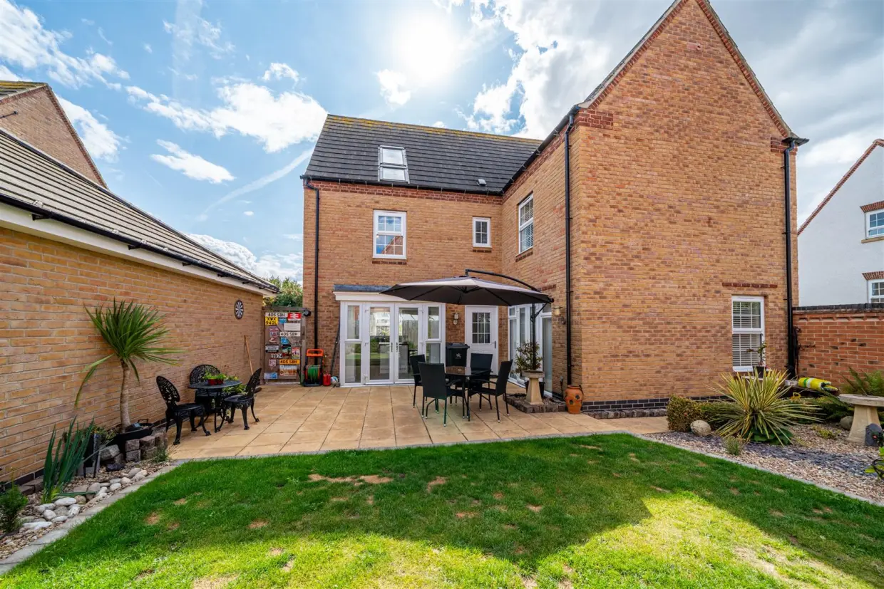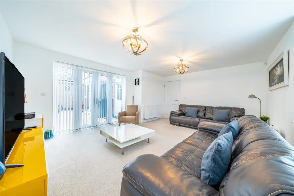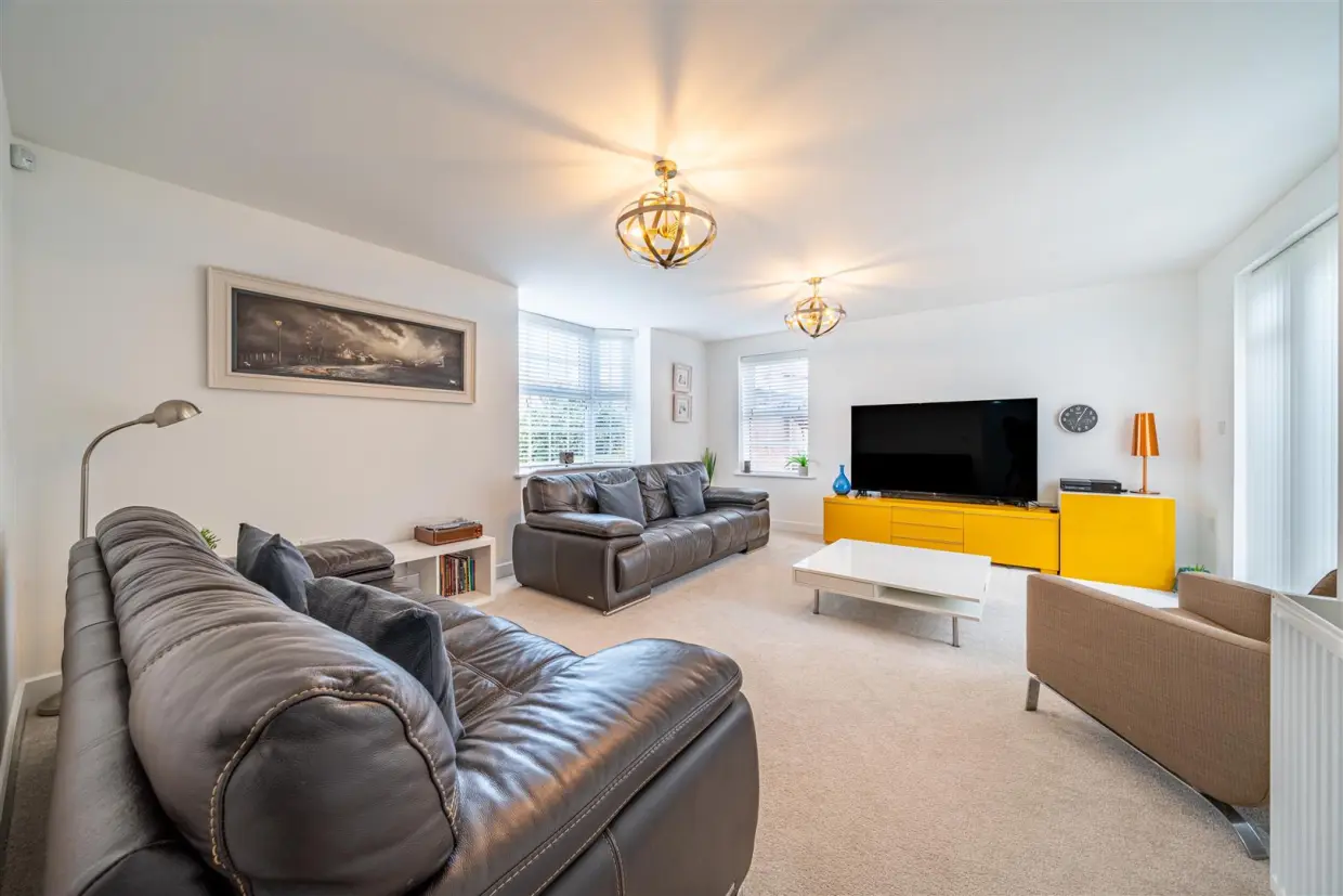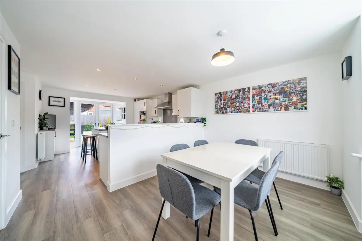 Presented in immaculate show-home condition, this outstanding detached family residence offers generous and flexible living space set across three well-planned floors.The home opens with a bright and welcoming entrance hallway, finished with Amtico flooring and offering excellent storage, including an under-stairs cupboard and a cloaks cupboard. From here, doors lead to the principal reception rooms. The beautifully appointed dining kitchen forms the heart of the home, fitted with a comprehensive range of high-gloss, soft-close units, granite work surfaces, and a central island. Integrated appliances include a dishwasher, fridge/freezer, double AEG ovens, and a six-ring hob with stainless steel extractor. A bay-fronted dining area and a further bay with French doors to the rear garden make this a perfect space for family life and entertaining. Leading off the kitchen, the utility room provides additional storage, a sink, and space for laundry appliances, with a door giving direct access to the garden.