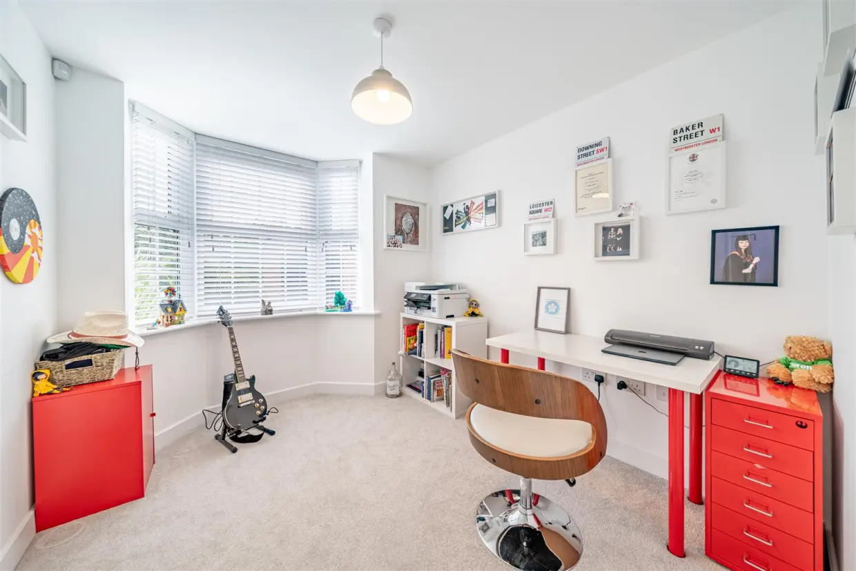 Also on the ground floor is a versatile study or family room with a bay window to the front, a modern WC, and a spacious dual-aspect living room. The living room enjoys both side and rear windows, together with French doors opening to the garden, flooding the space with natural light and creating a welcoming area for relaxation.