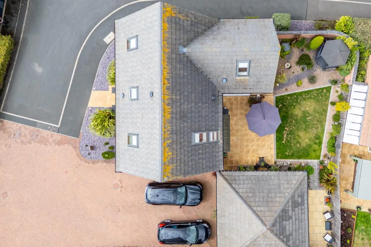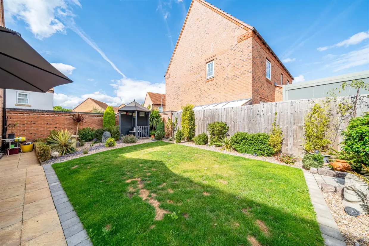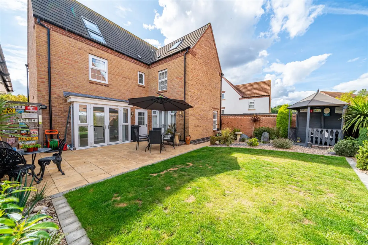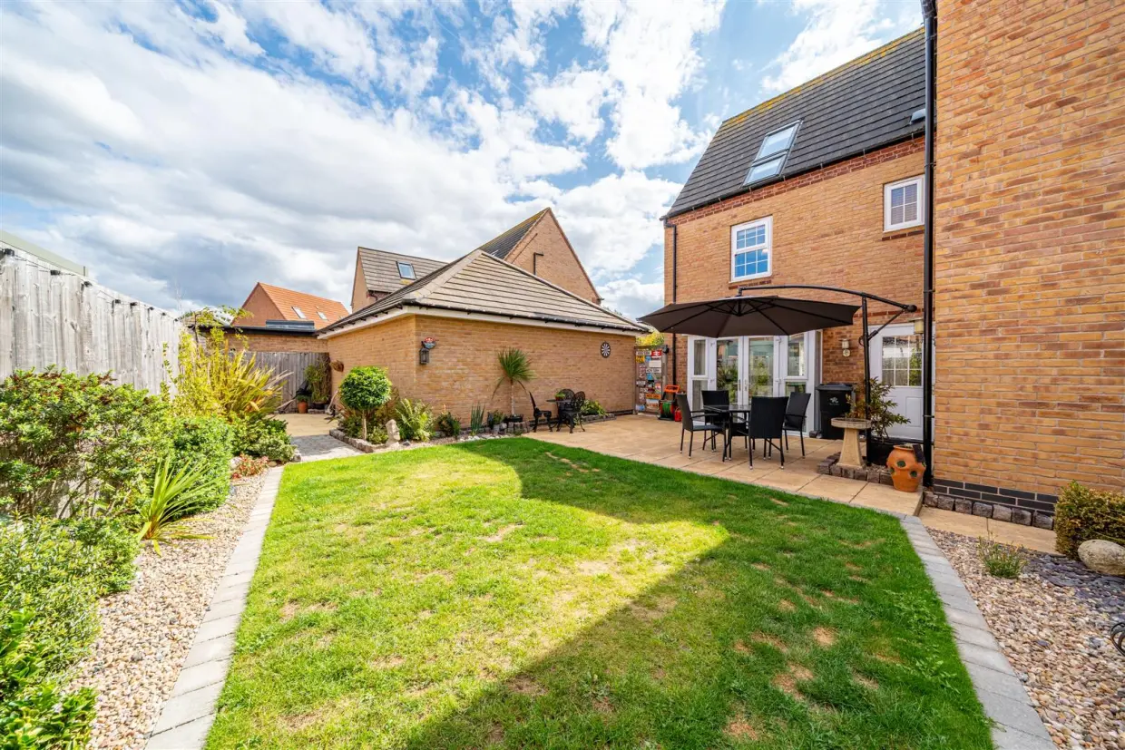 Outside, the property is set on a cul-de-sac, ensuring a peaceful setting. A block-paved driveway provides ample parking and leads to a detached double garage, complete with an electric car charging point. The rear garden is privately enclosed and beautifully designed with a shaped lawn, multiple seating areas, established planting, and a charming covered "bandstand" style feature. External lighting, water, and power further enhance the outdoor space, making it perfect for entertaining.