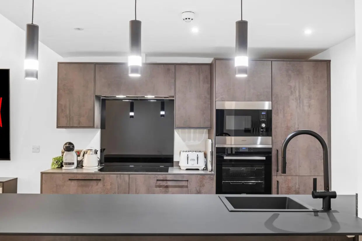 A high-end kitchen with integrated appliances, sleek cabinetry, and stylish fixtures.
