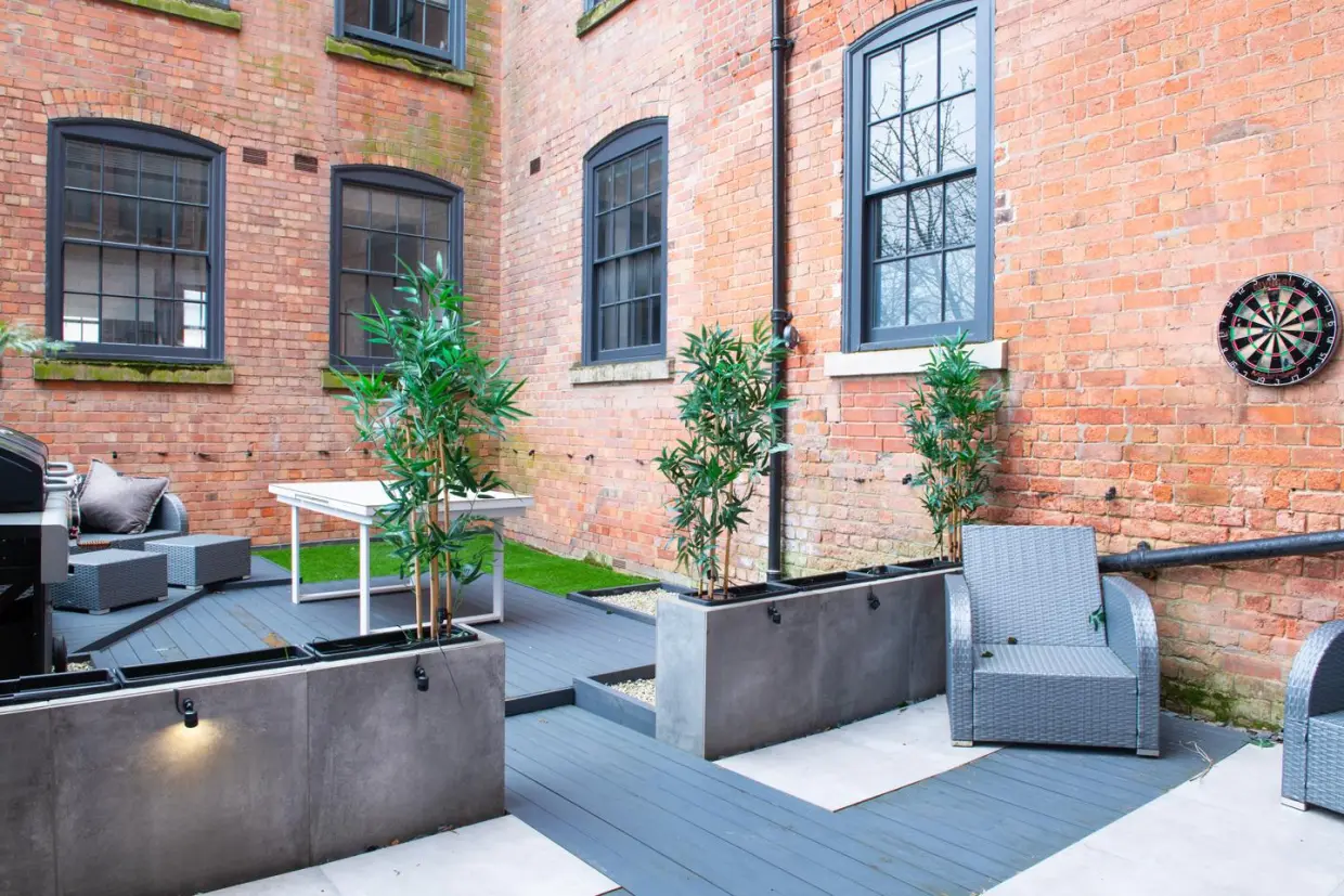 Private south-facing terrace-an outdoor retreat featuring composite decking, seating areas, and a BBQ space.