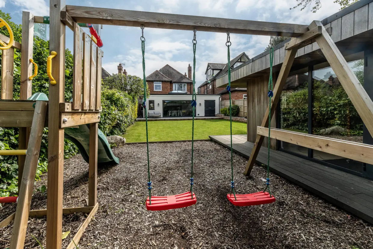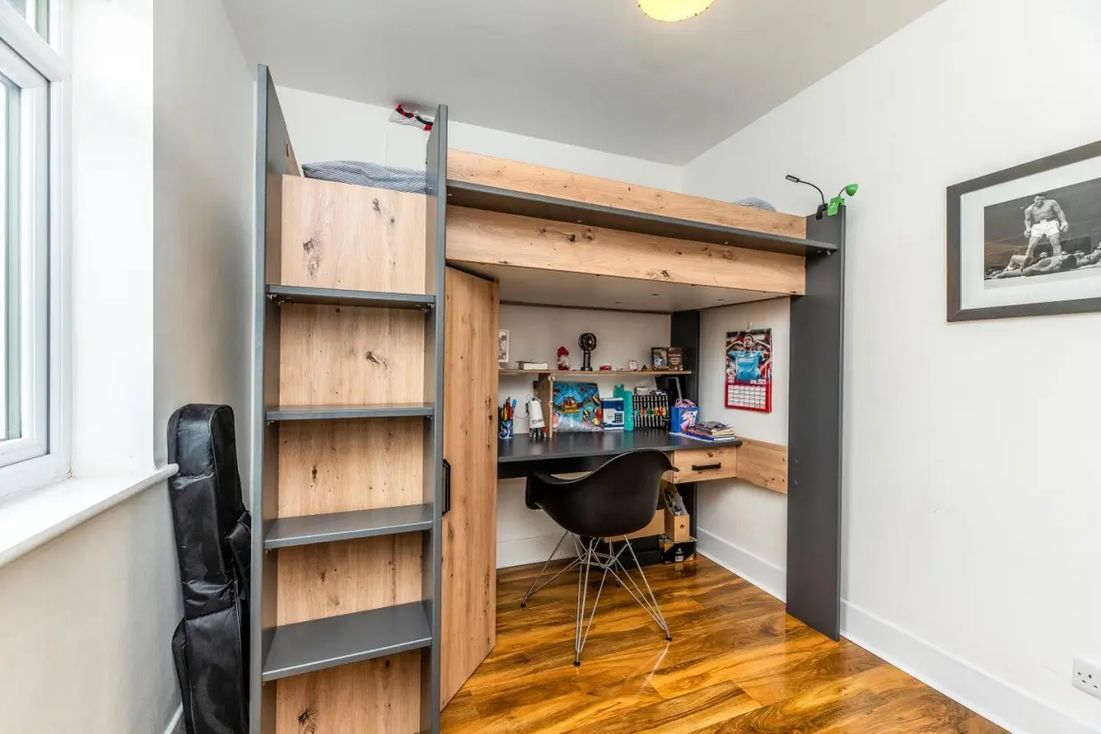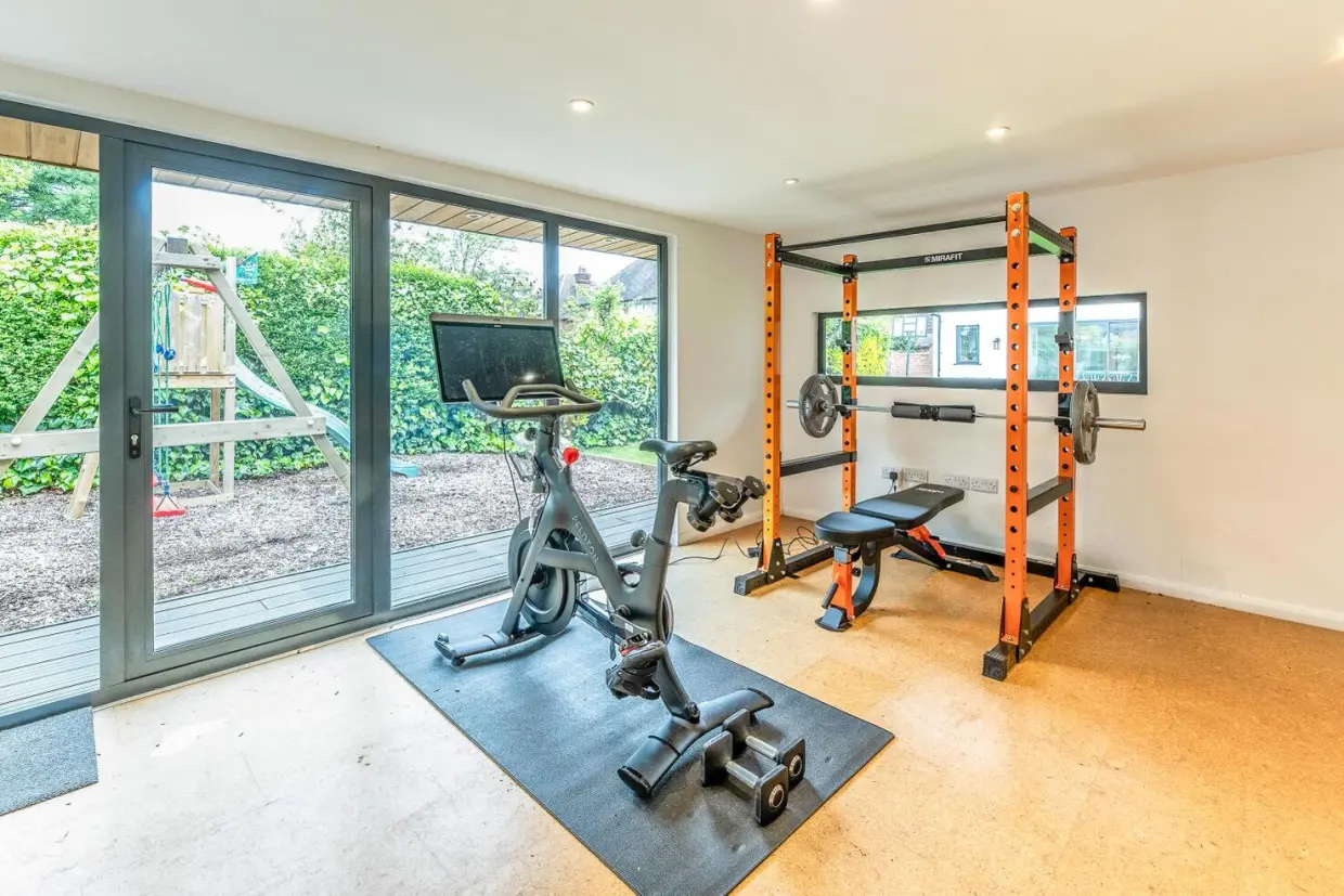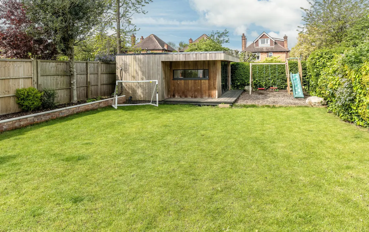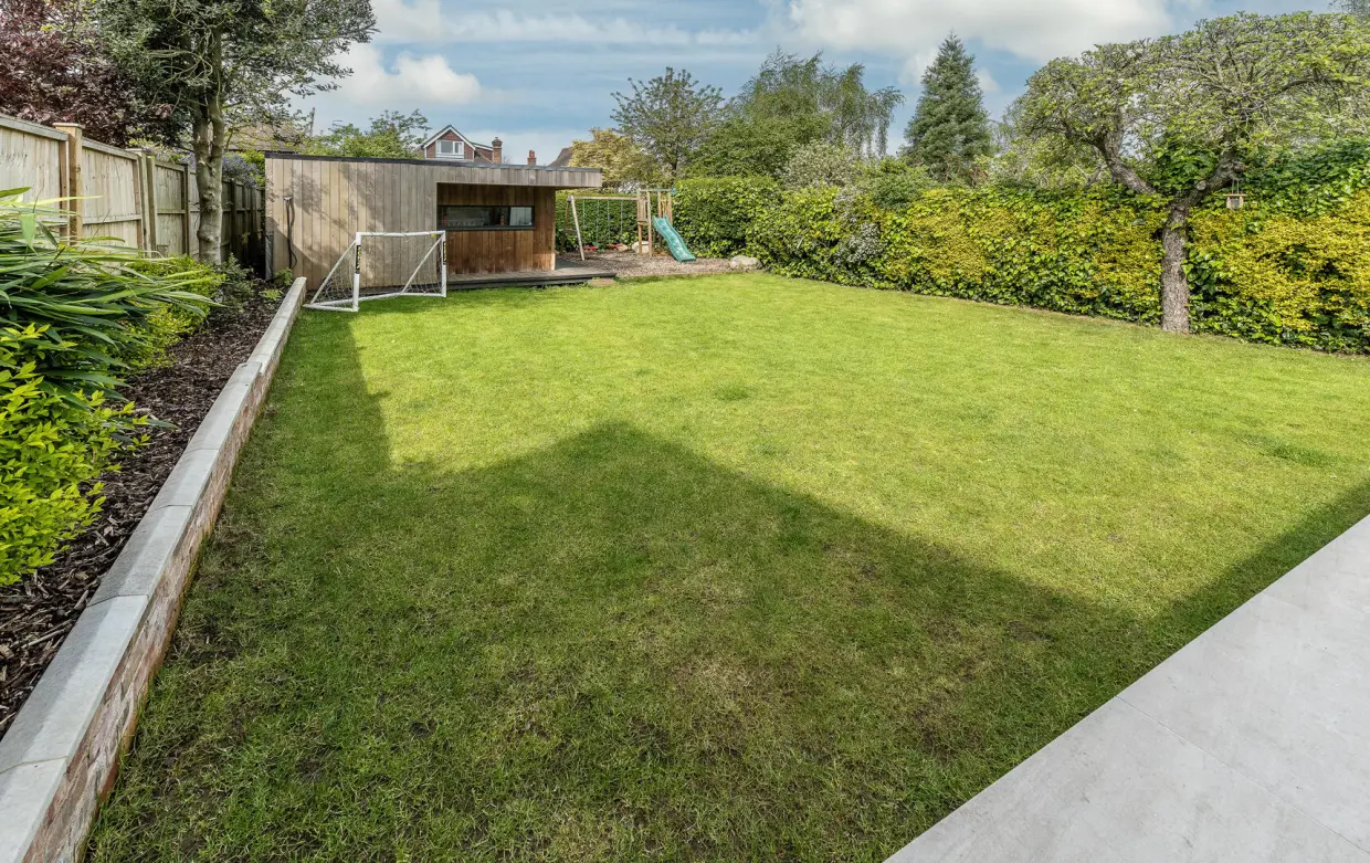 The rear garden includes a stone-laid patio ideal for outdoor entertaining, with the majority of the garden laid to lawn and surrounded by well-stocked borders featuring a variety of mature trees and shrubs. A woodchip-covered hardstanding leads to a large, timber-built garden outbuilding, fully insulated and equipped with power, lighting, and Wi-Fi. This superb space includes a decked terrace and is currently used as a gym, though it has also served as an office. Built-in storage adds further practicality, making it an outstanding and versatile addition to the property.