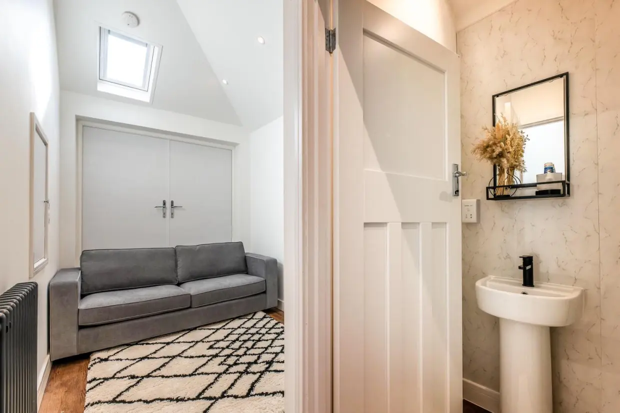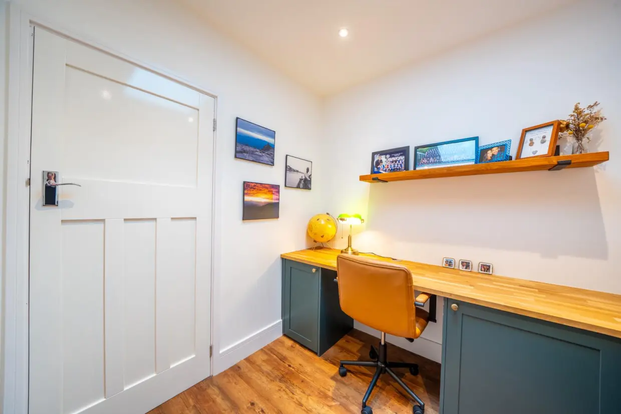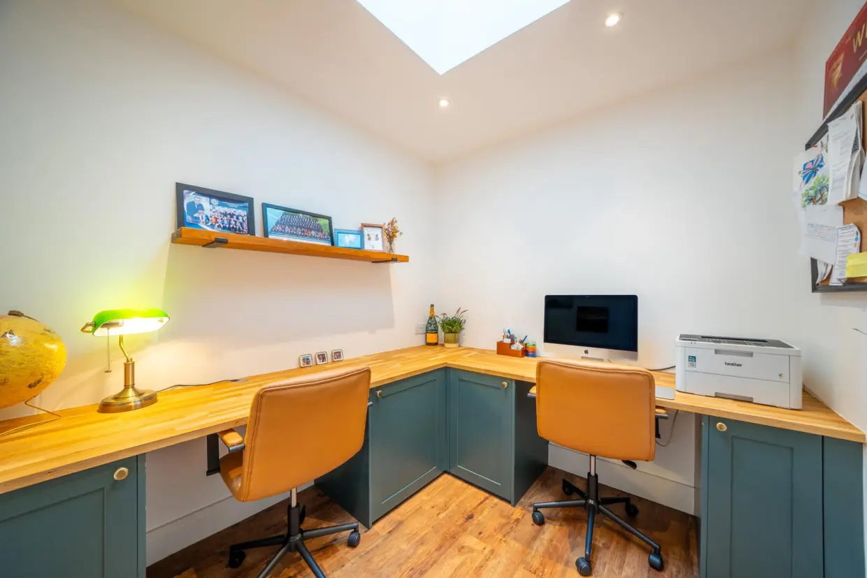 To the far side, a door opens into a study area beneath a second roof lantern, which connects to a snug/studio space at the front of the property. This versatile area has front-facing doors and windows and benefits from an en-suite shower room. It offers excellent potential as a self-contained suite for an elderly relative, guest accommodation, or an ideal home office.