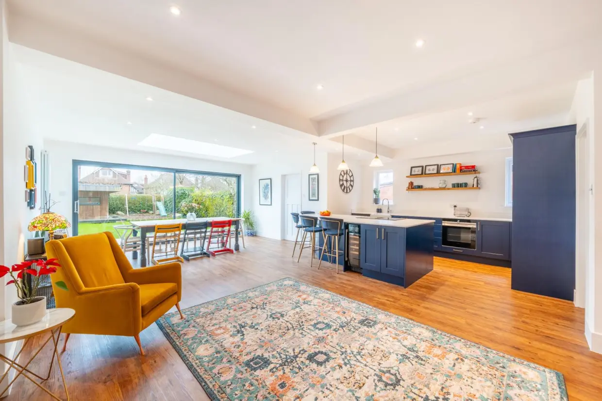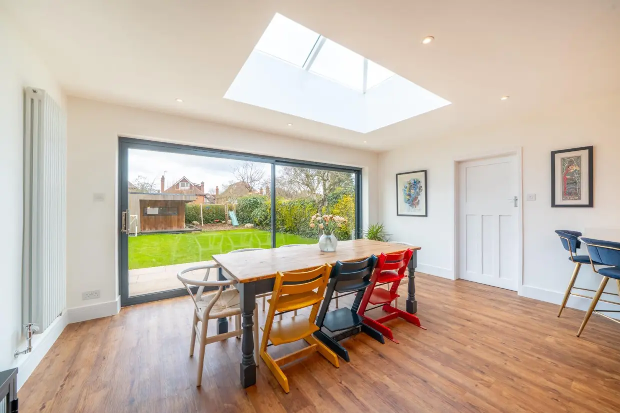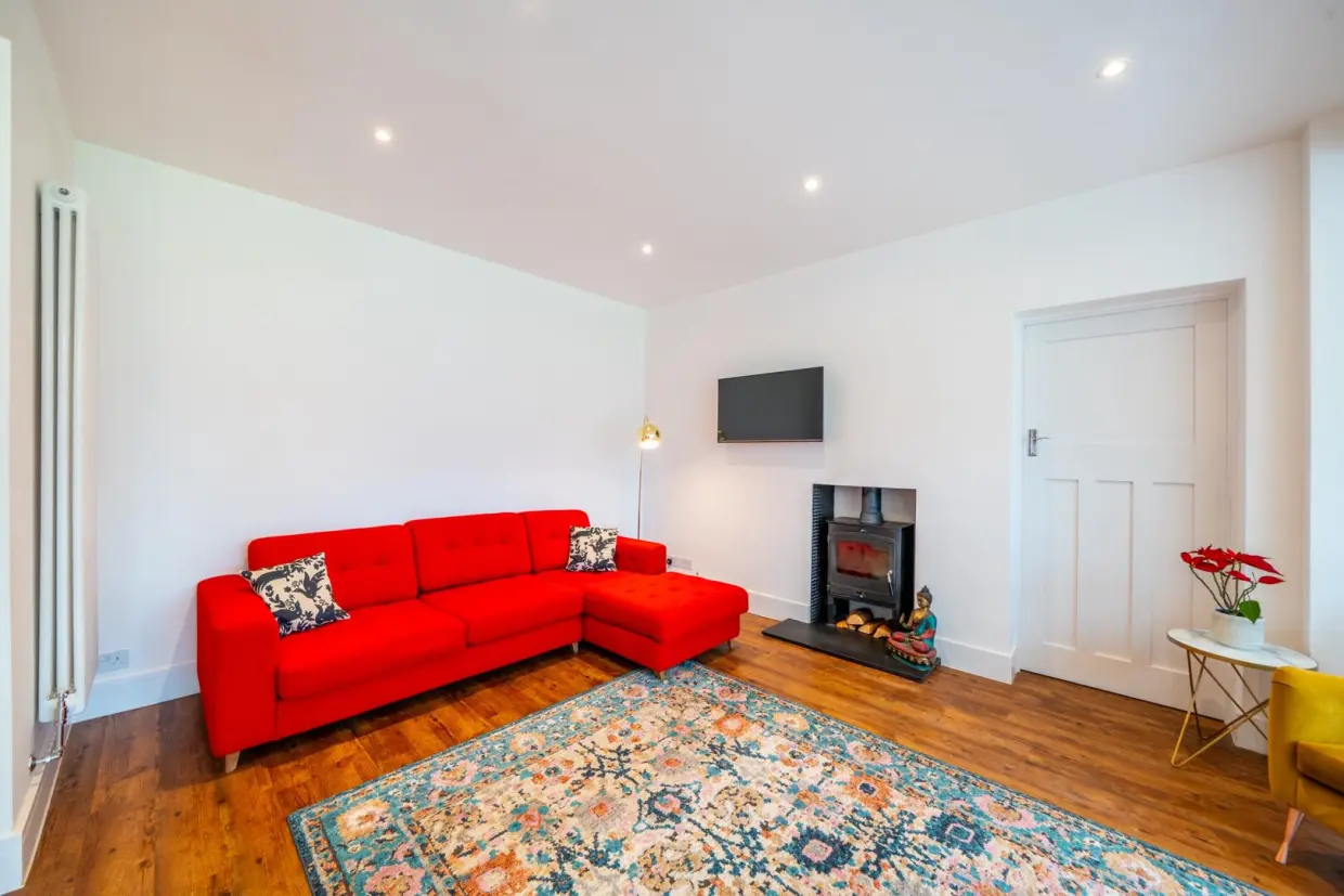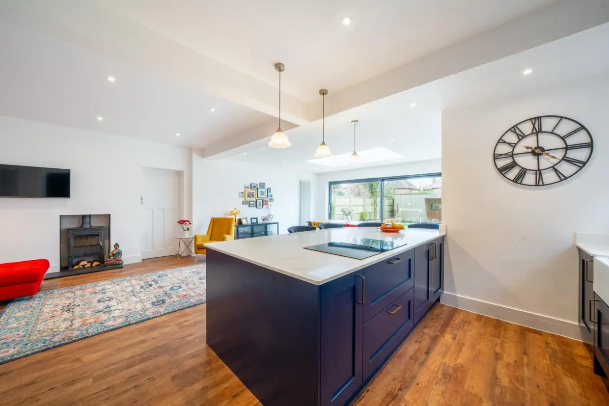 The property is entered via a traditional arched porch and a high-quality composite front door, opening into a generous reception hallway. This space features wood-effect Amtico flooring, column radiators, and a staircase rising to the first floor. Doors lead to the front reception room, which is beautifully appointed with a double-glazed bay window, built-in book shelving recessed into the chimney breast, a stone hearth, and a cast iron log-burning stove. An integrated ceiling-mounted projector transforms this room into an ideal cinema space.Off the hallway, there is a contemporary two-piece WC situated beneath the staircase, along with a built-in cloaks storage cupboard. At the end of the hallway, you enter a breathtaking open-plan living kitchen-an expansive and light-filled space with panoramic views over the rear garden. Features include a continuation of the wood-effect flooring, a roof lantern, sliding glass doors, wall-mounted column radiators, and a stylish kitchen fitted with painted base units, quartz stone worktops, and a central island with breakfast bar. Integrated high-spec appliances are included, and a doorway leads to a separate utility area with further garden access.
