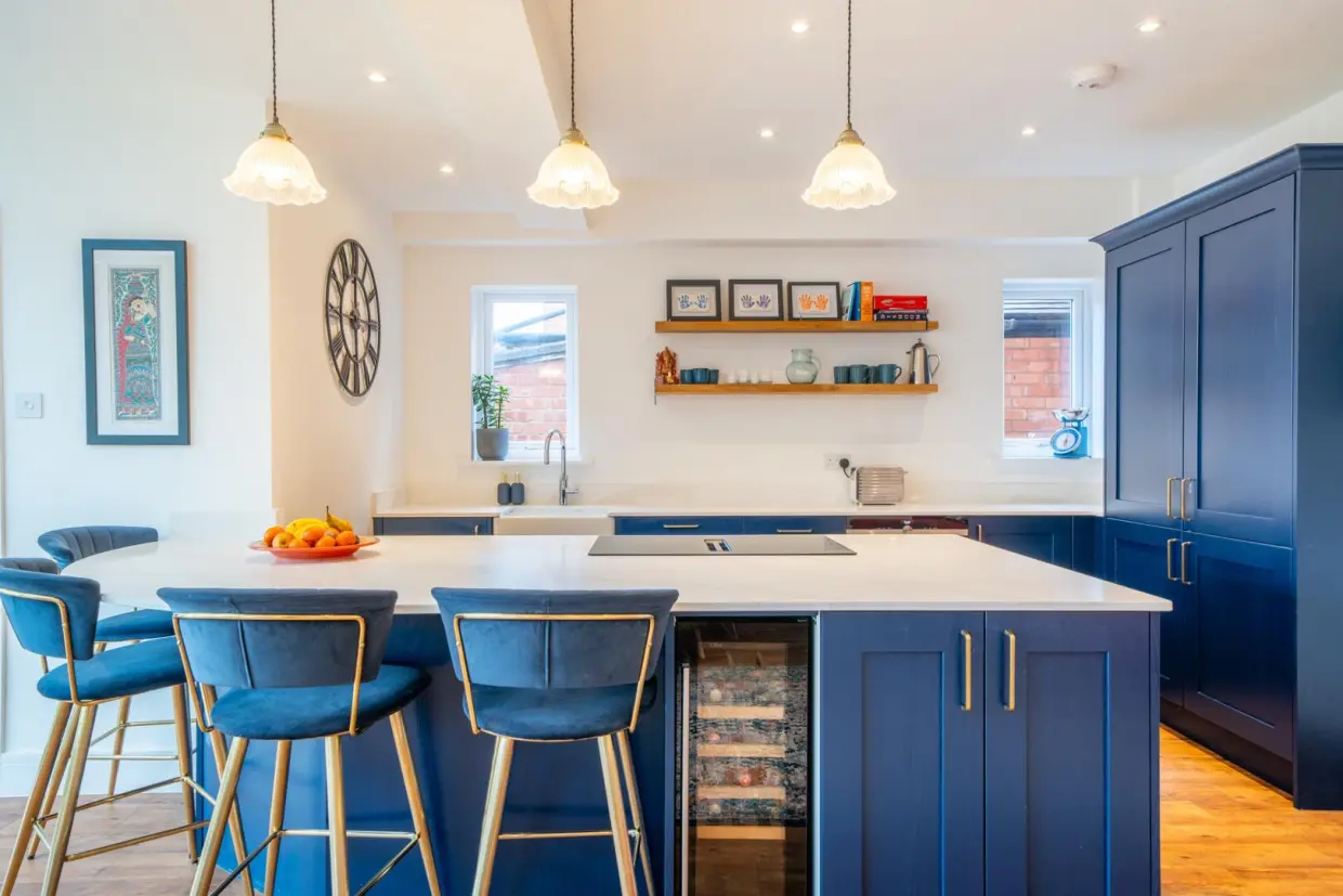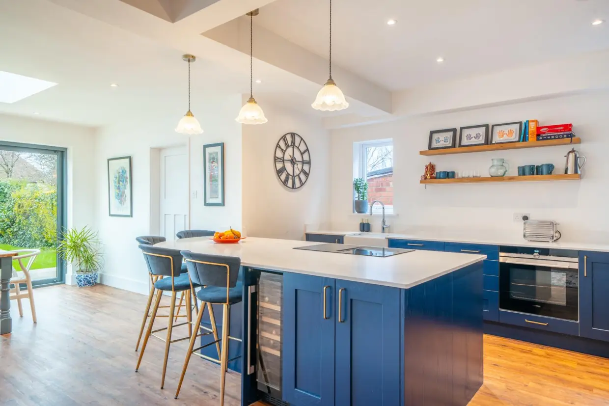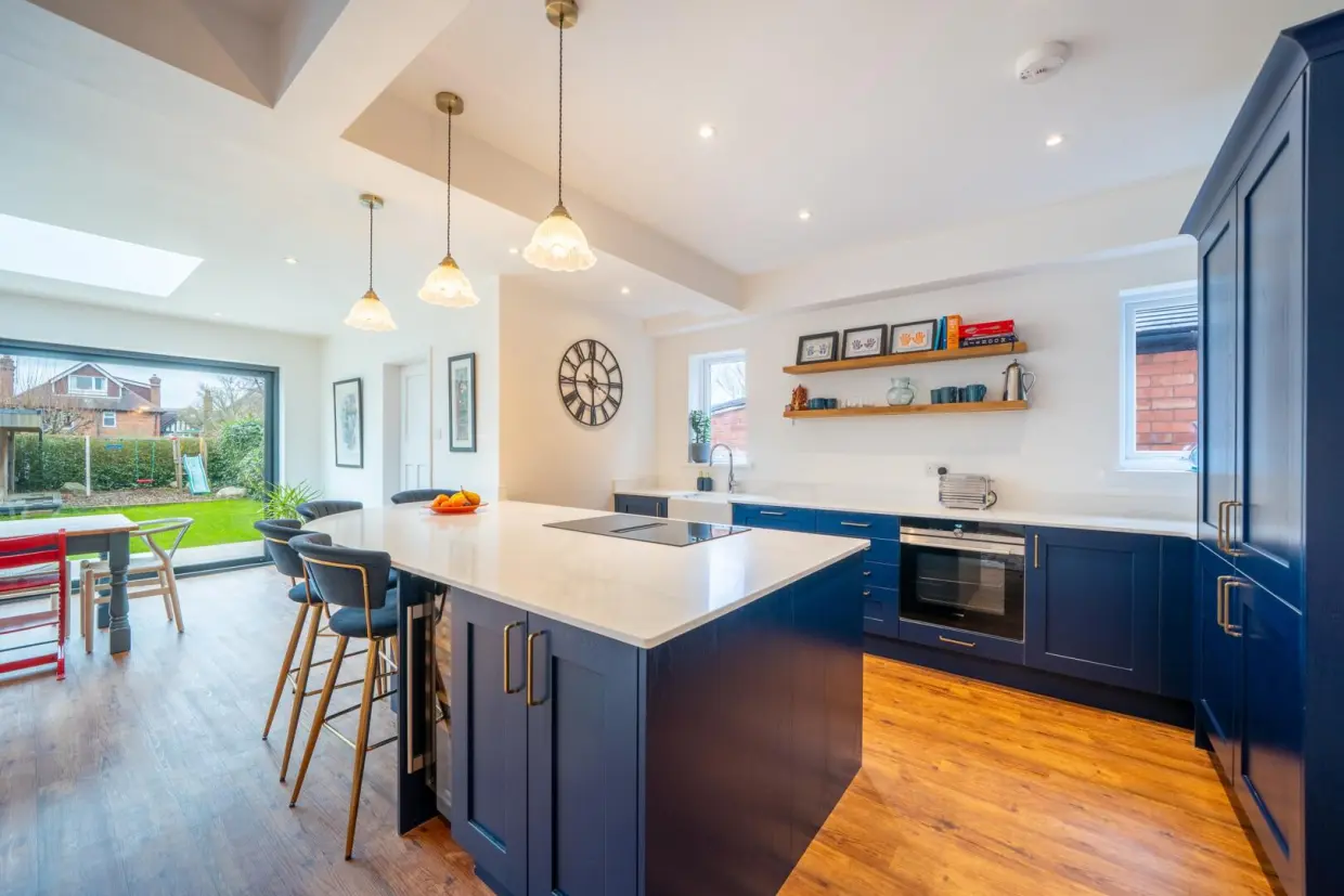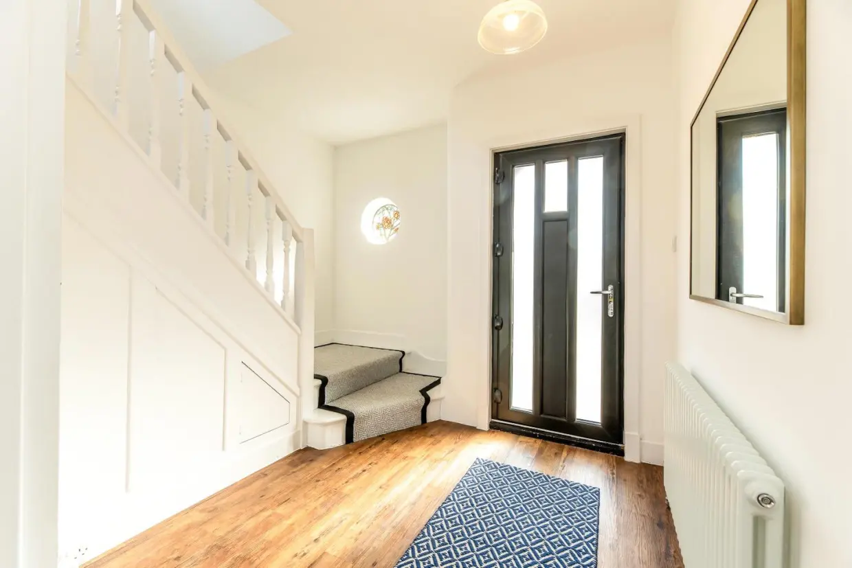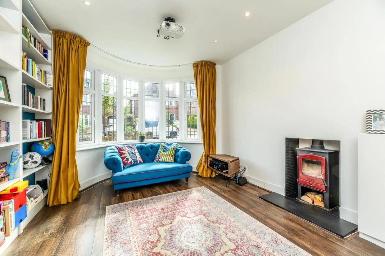 The property is entered via a traditional arched porch and a high-quality composite front door, opening into a generous reception hallway. This space features wood-effect Amtico flooring, column radiators, and a staircase rising to the first floor. Doors lead to the front reception room, which is beautifully appointed with a double-glazed bay window, built-in book shelving recessed into the chimney breast, a stone hearth, and a cast iron log-burning stove. An integrated ceiling-mounted projector transforms this room into an ideal cinema space.Off the hallway, there is a contemporary two-piece WC situated beneath the staircase, along with a built-in cloaks storage cupboard. At the end of the hallway, you enter a breathtaking open-plan living kitchen-an expansive and light-filled space with panoramic views over the rear garden. Features include a continuation of the wood-effect flooring, a roof lantern, sliding glass doors, wall-mounted column radiators, and a stylish kitchen fitted with painted base units, quartz stone worktops, and a central island with breakfast bar. Integrated high-spec appliances are included, and a doorway leads to a separate utility area with further garden access.