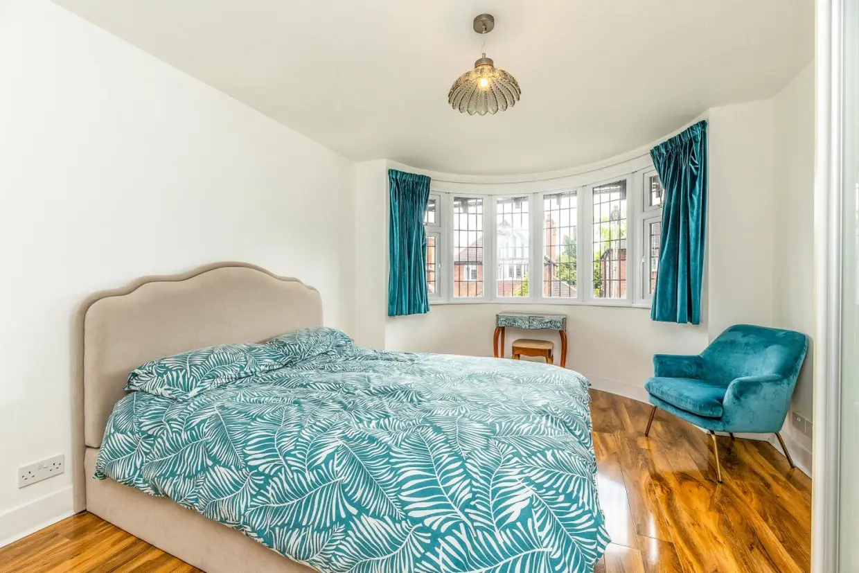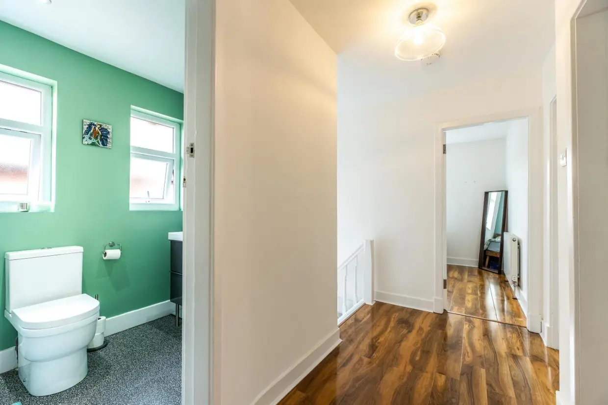 Upstairs, the landing features a side-facing window and wood-effect vinyl flooring. Doors lead to four bedrooms and a modern three-piece family bathroom. Bedrooms one and two both feature built-in wardrobes, with the principal front bedroom enjoying a feature bay window.