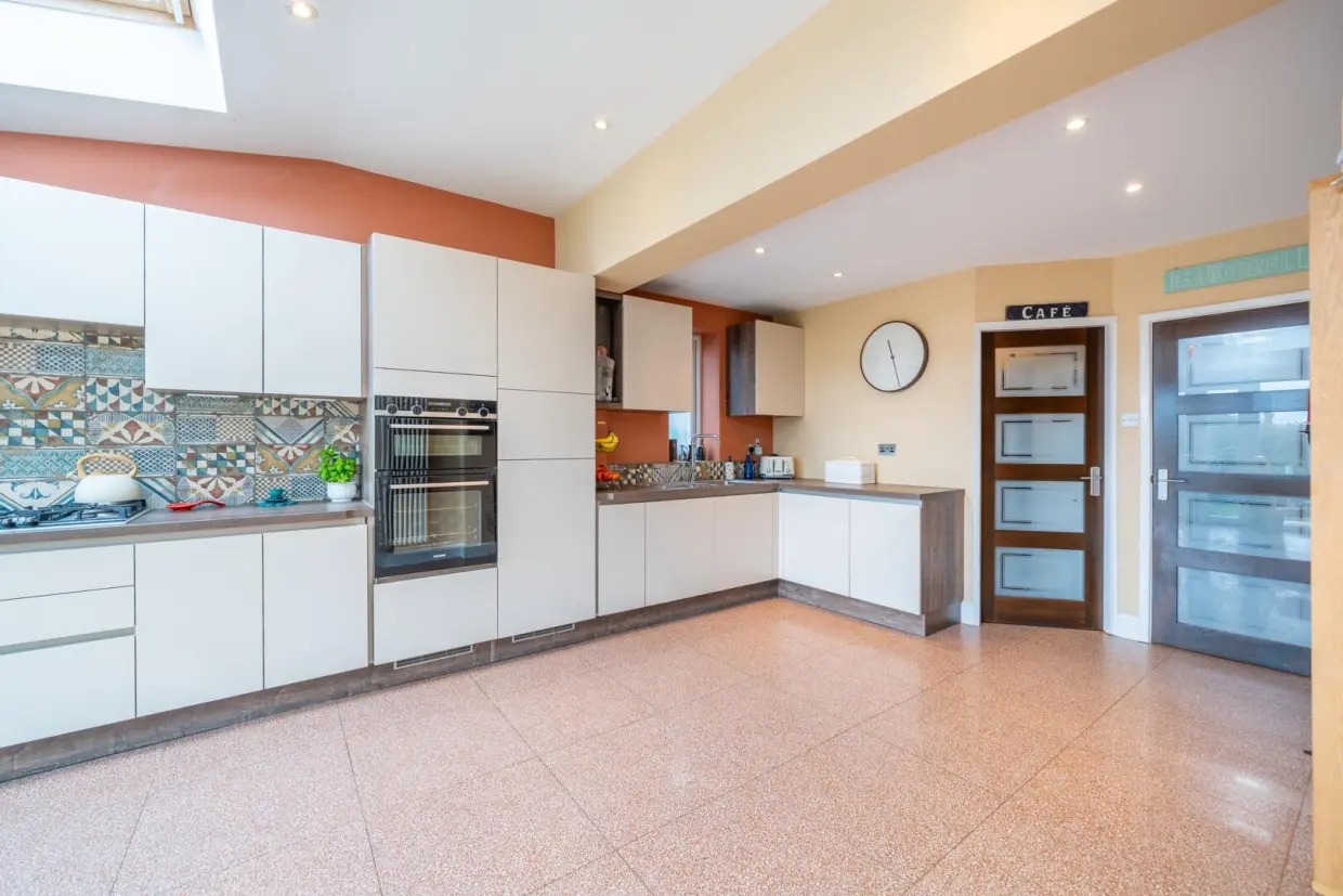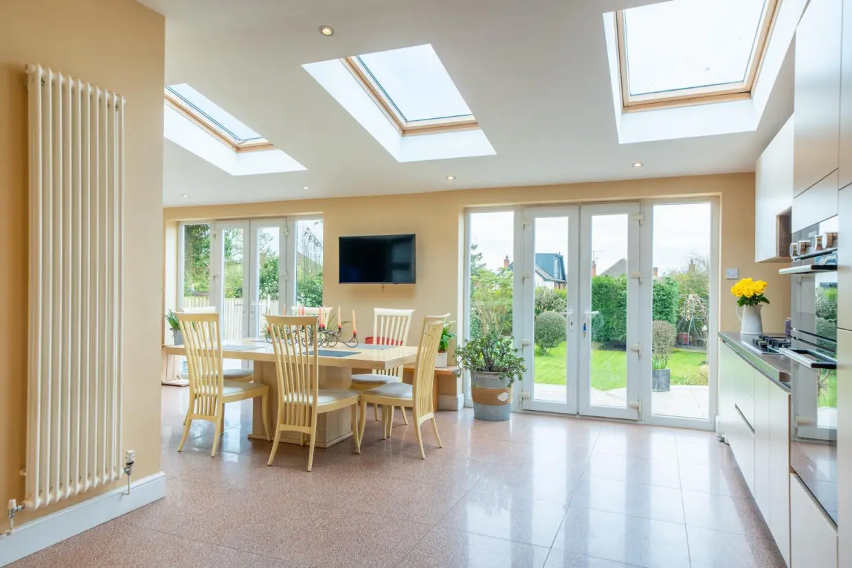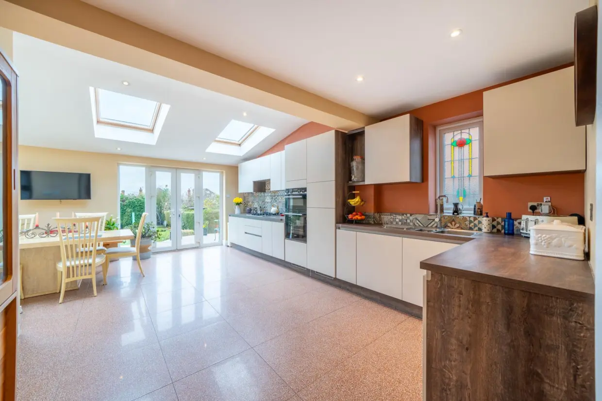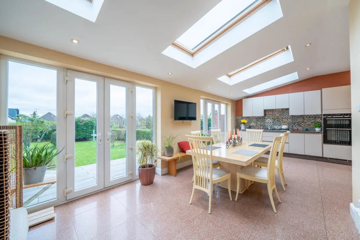 - Impressive open-plan living dining kitchen with vaulted ceilings and rooflights
