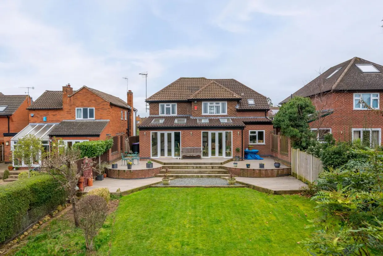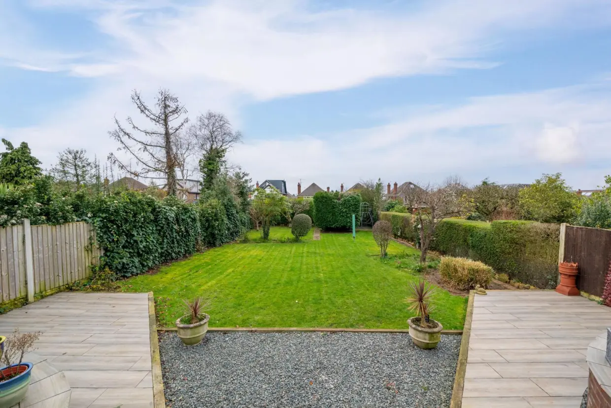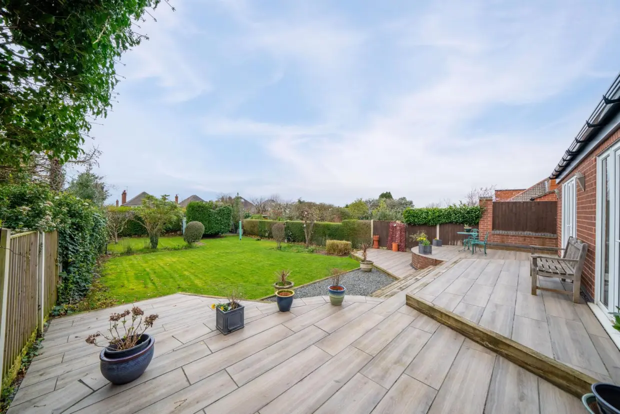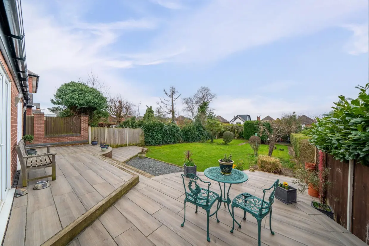 The rear garden is a fantastic outdoor space, ideal for enjoying sunny days. A generous tiled terrace patio spans the width of the property, perfect for outdoor dining and entertaining, with steps leading down to a lawned garden bordered by a variety of established planting beds and shrubs. To the rear is a hardstanding area suitable for a garden shed, and the garden benefits from a desirable south-westerly aspect, enjoying sunshine throughout much of the day.