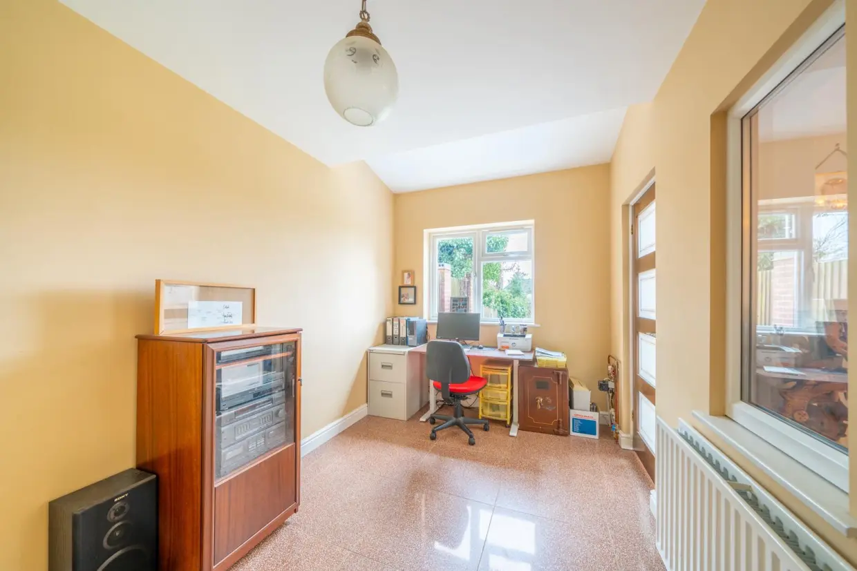 To the rear of the property there is also a versatile office/snug/playroom, offering additional flexible living space with continued tiled flooring, a window overlooking the garden and internal access to the integral garage.