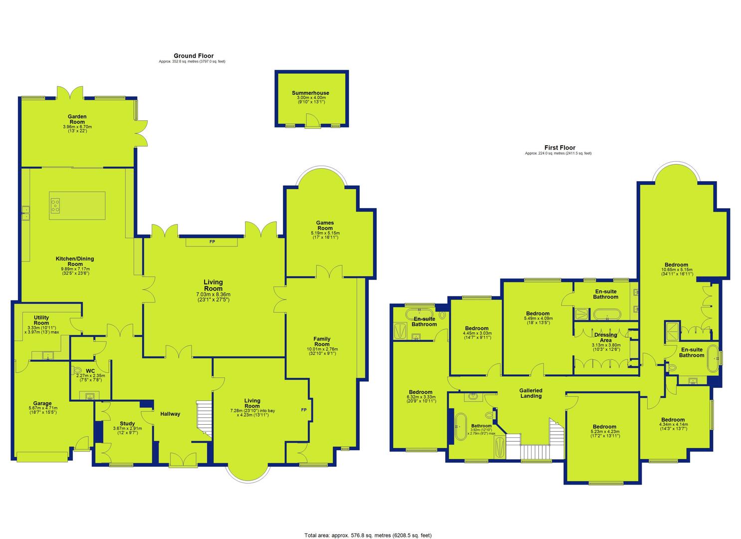 The heart of the home is a stunning open-plan kitchen and dining area, spanning over 9.8 metres in width, anchored by a generous central island and flowing effortlessly into a bright garden room, creating a spectacular space for gatherings, celebrations, or quiet family moments. The ground floor further offers a formal living room with a feature fireplace, a secondary sitting room with a charming bay window, a dedicated family room, a games room, and a private study, complemented by a utility and cloakroom, providing the ultimate in flexibility and comfort. A detached summerhouse to the rear adds an inspiring space for a studio, home office, or personal retreat.Upstairs, six beautifully proportioned bedrooms include a master suite with a private dressing area, luxurious en-suite bathroom, and a distinctive curved frontage, while several additional bedrooms enjoy en-suite facilities, supported by a substantial family bathroom. Four bathrooms in total ensure practicality and privacy for family life and guests alike.