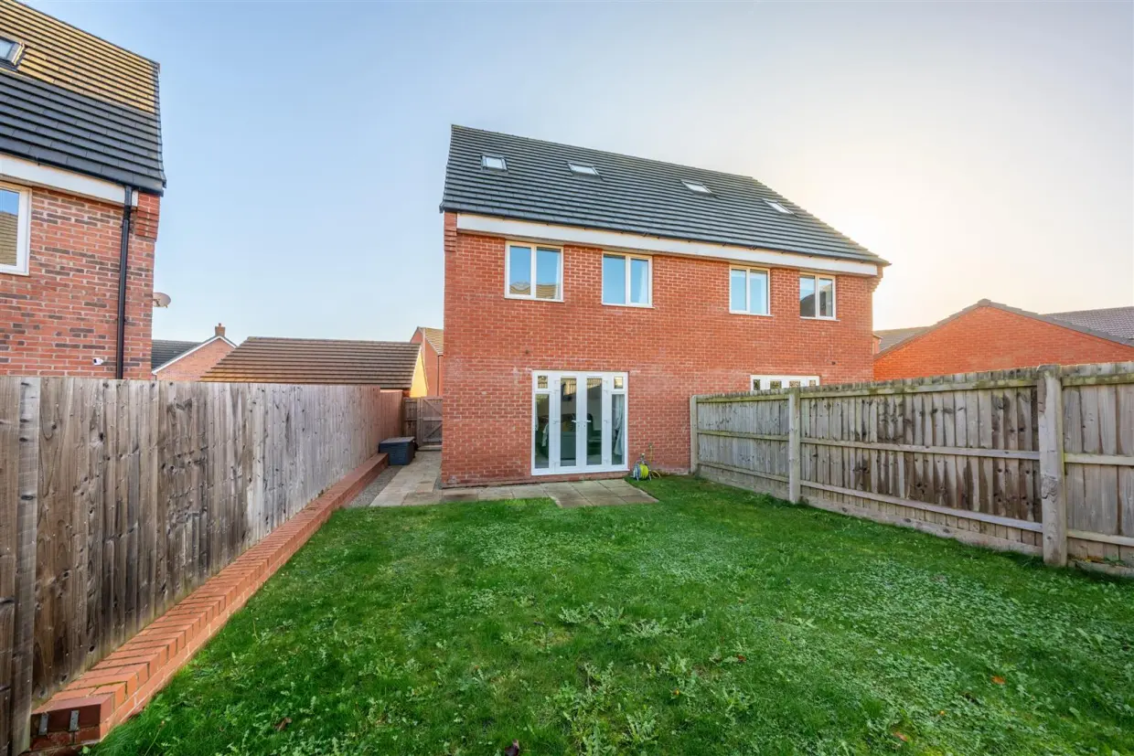 To the front of the property, a double driveway provides off-street parking for two vehicles. The rear garden includes a patio area ideal for outdoor dining and relaxation, along with a lawned section bordered by fencing for added privacy.