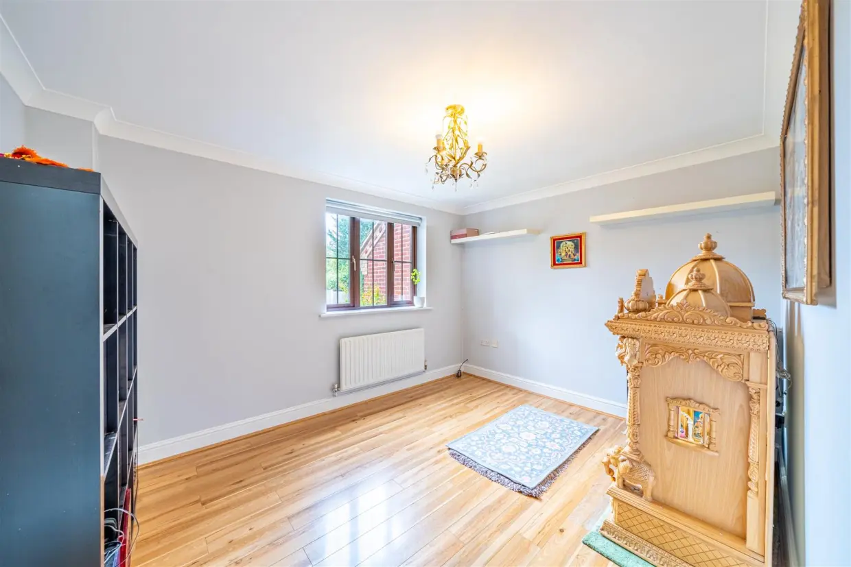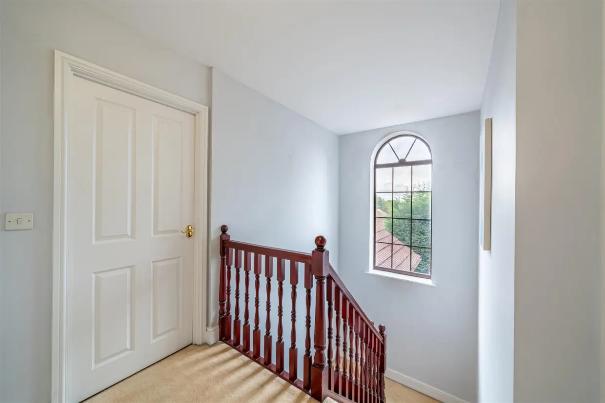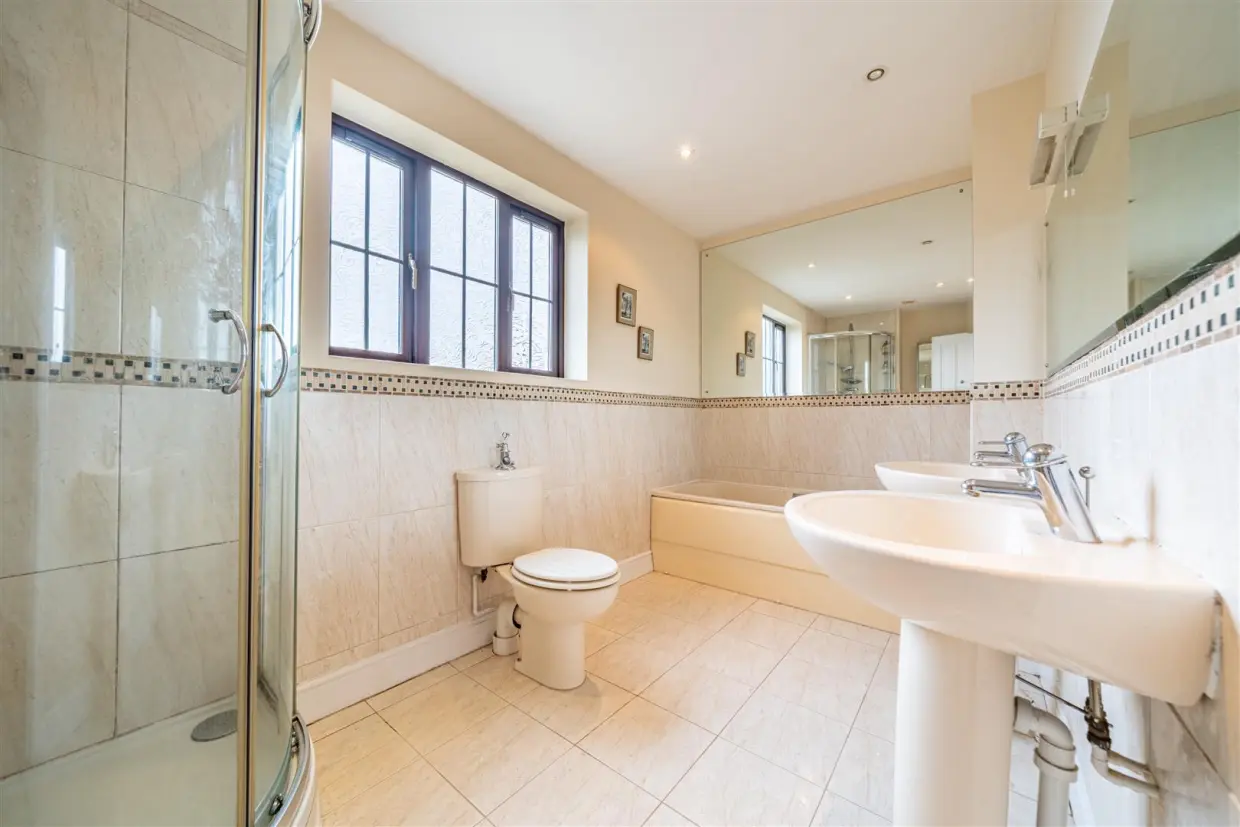 A glazed arch feature window floods the staircase with natural light, leading to five well-appointed bedrooms. The master suite includes extensive fitted wardrobes, a dressing area, and a luxurious ensuite complete with bath, twin basins, and separate shower. Four further bedrooms all benefit from fitted storage, with two enjoying their own ensuite bathrooms. A stylish family bathroom with bath, double shower, WC, and wash basin completes the floor.