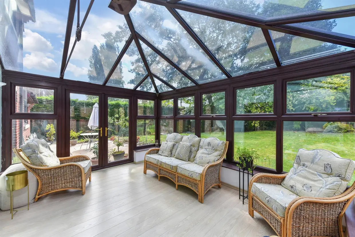 The property opens with a welcoming entrance hall, finished with striking Porcelanosa marble flooring and mosaic detailing, complemented by excellent storage. Living spaces include a bright and spacious lounge, a formal dining room, and a separate TV room. The breakfast kitchen is fitted with elegant Cherrywood cabinetry, granite worktops, a RangeMaster oven, and integrated Neff appliances (fridge/freezer, microwave, and dishwasher). Matching Porcelanosa tiled flooring extends throughout, while French doors lead onto the rear garden. Additional accommodation includes a conservatory, playroom/snug, utility room with fitted storage and appliance plumbing, and a cloakroom/WC.