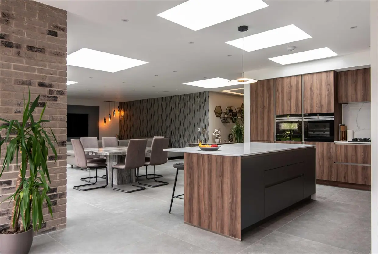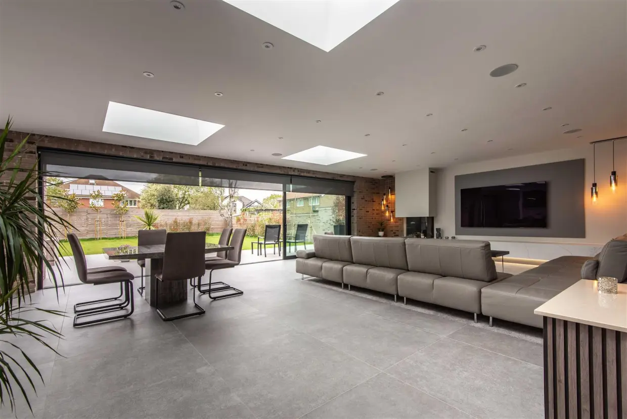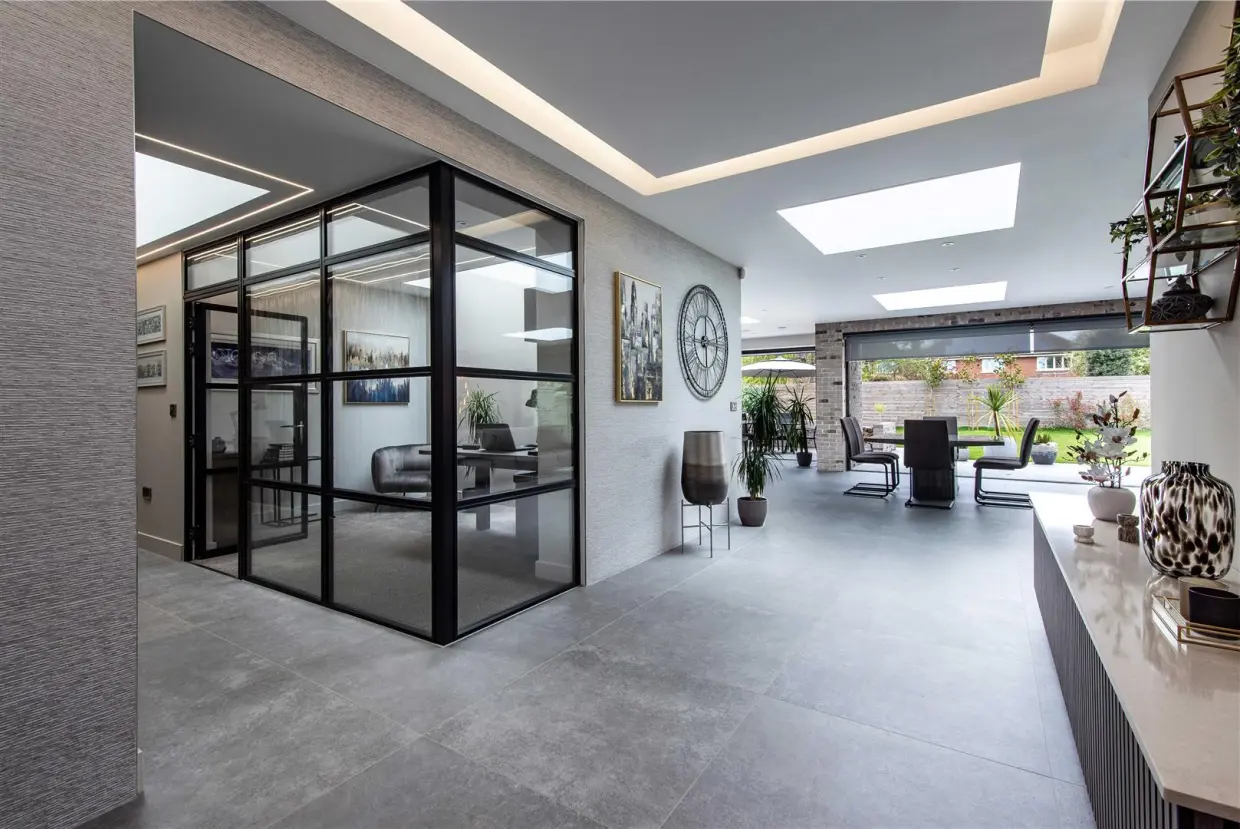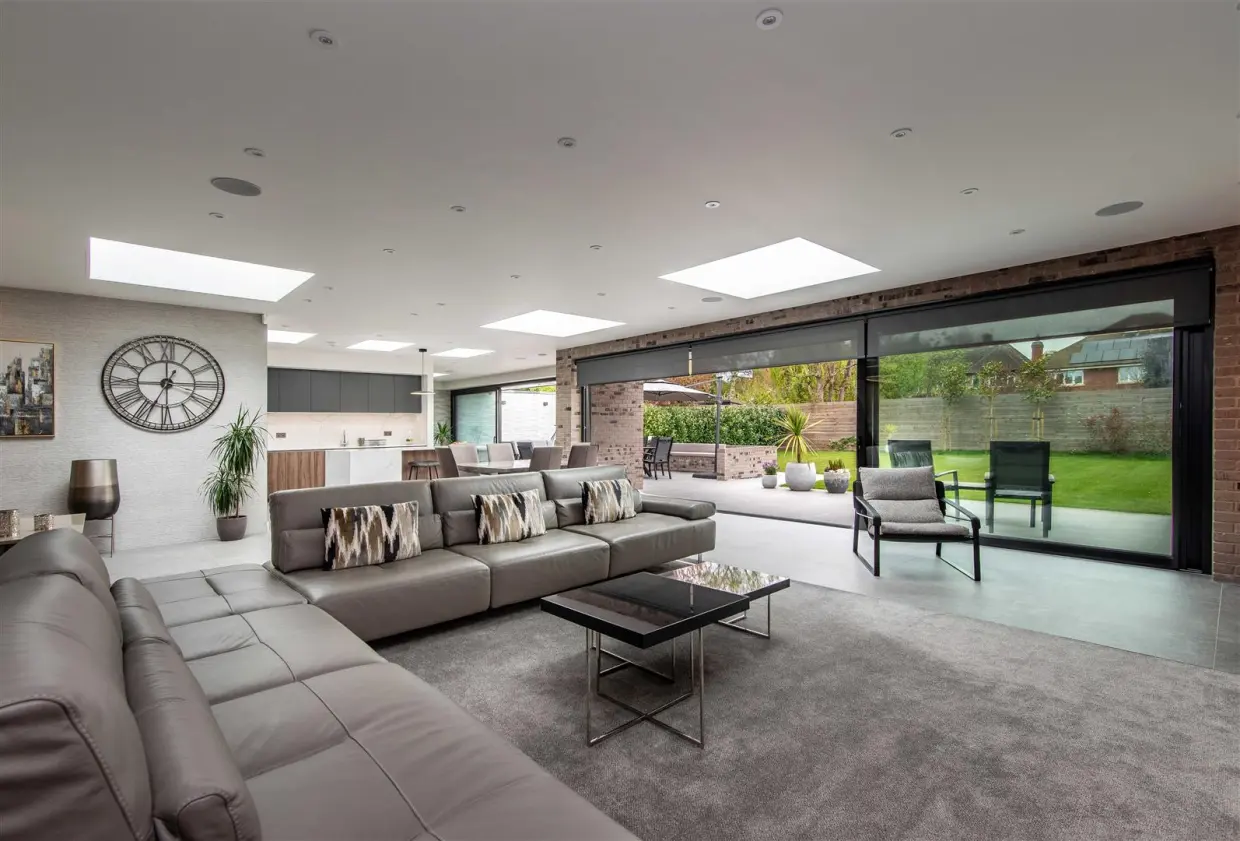 The home opens with a stylish entrance porch, leading into an expansive reception hall - a dramatic space that doubles beautifully as an area for entertaining. At the rear, the show-stopping heart of the home unfolds: a spectacular open-plan living space bathed in natural light. Three oversized sliding patio doors seamlessly connect indoors to the beautifully landscaped garden, blurring the lines between inside and out. Seven skylights elevate the atmosphere further, casting a radiant glow across bespoke feature walls that echo the home's external textures.