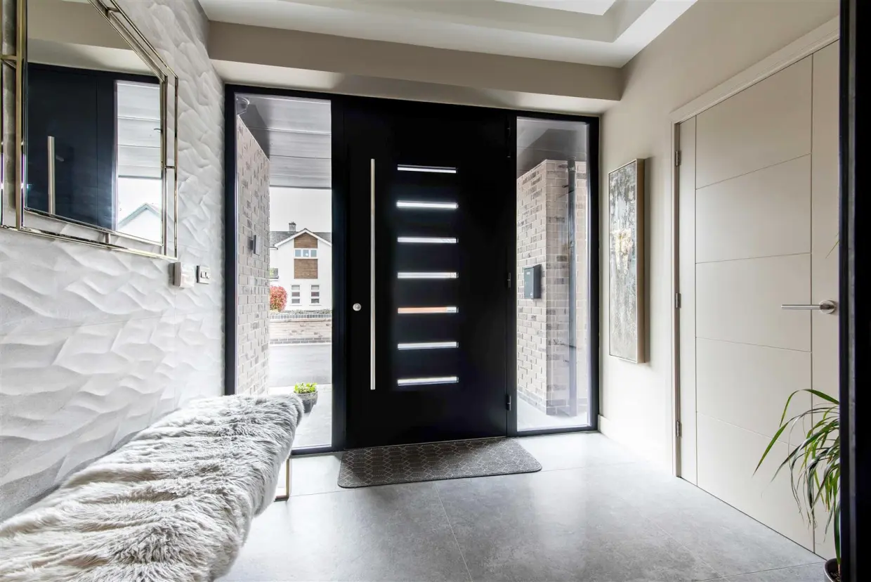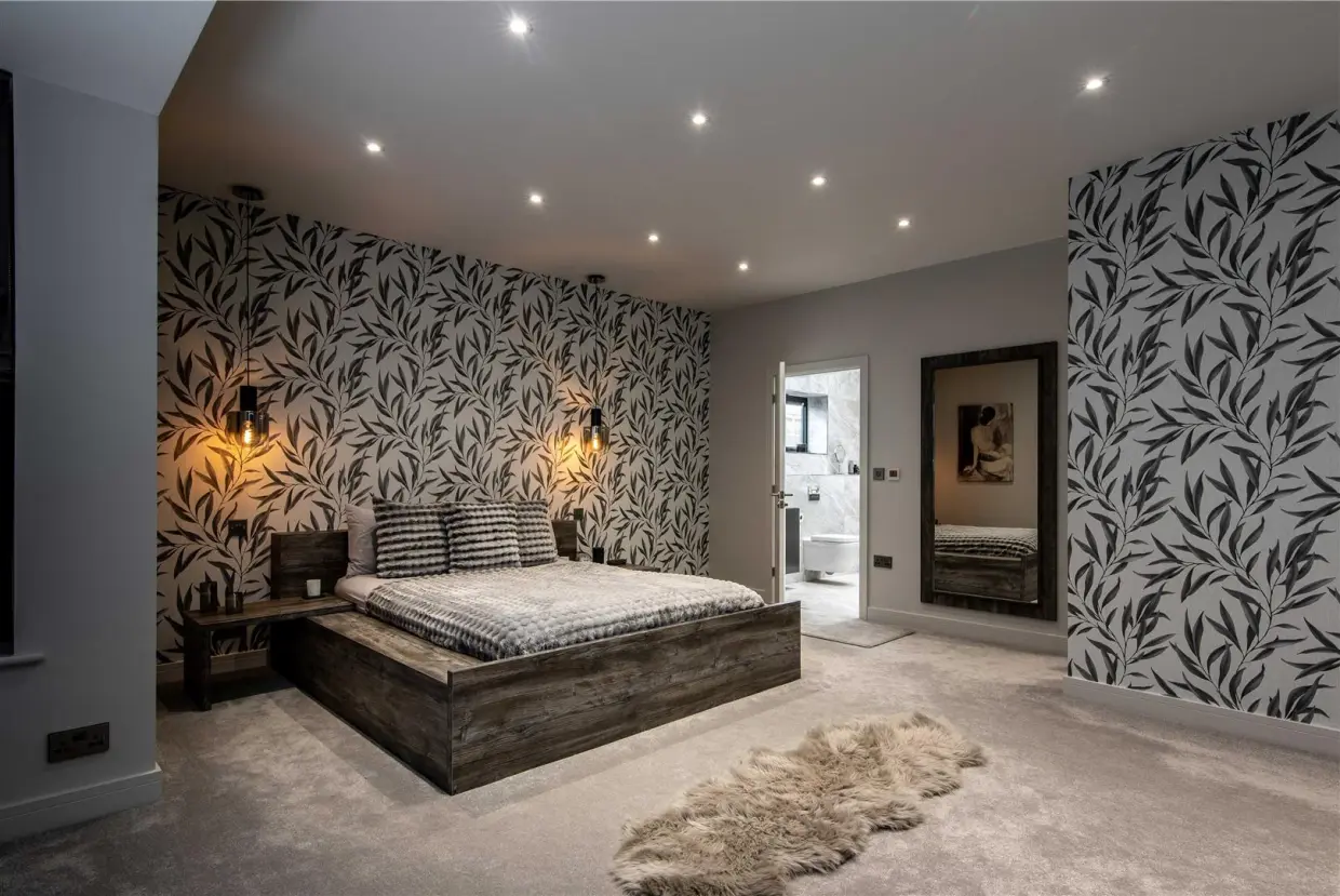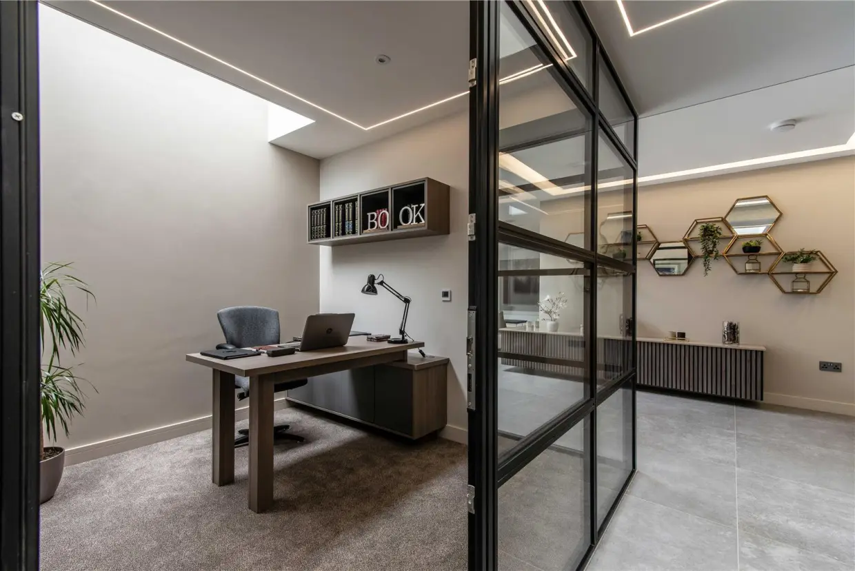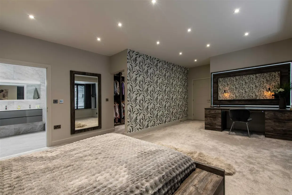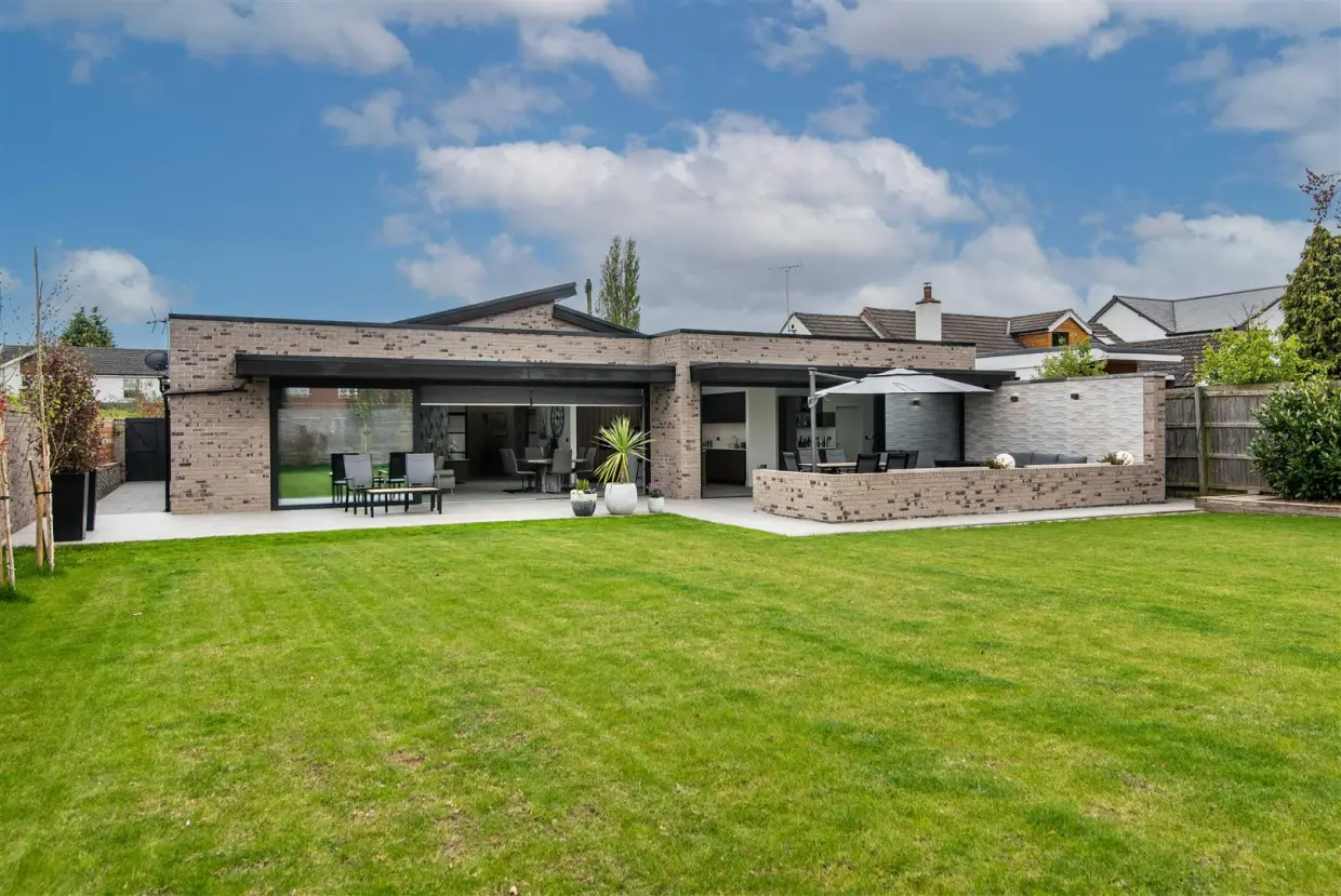 The home opens with a stylish entrance porch, leading into an expansive reception hall - a dramatic space that doubles beautifully as an area for entertaining. At the rear, the show-stopping heart of the home unfolds: a spectacular open-plan living space bathed in natural light. Three oversized sliding patio doors seamlessly connect indoors to the beautifully landscaped garden, blurring the lines between inside and out. Seven skylights elevate the atmosphere further, casting a radiant glow across bespoke feature walls that echo the home's external textures.