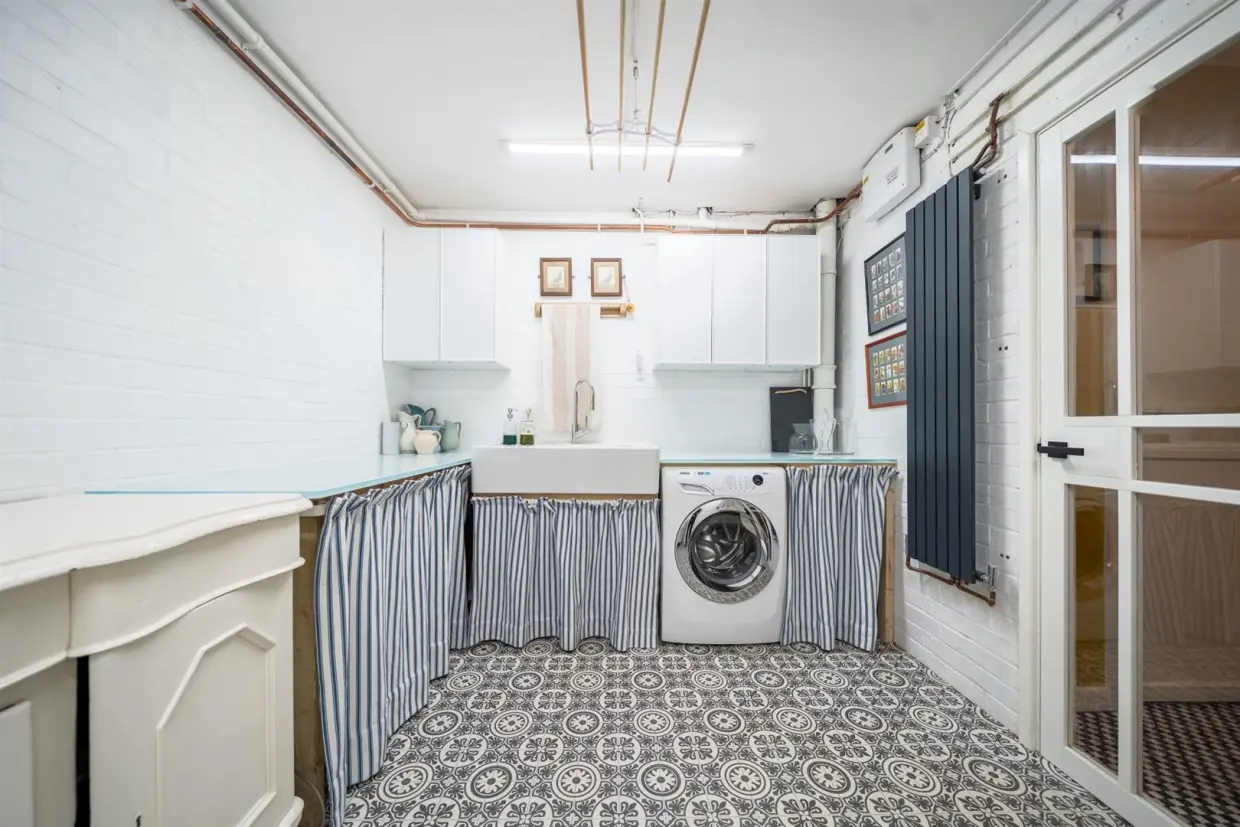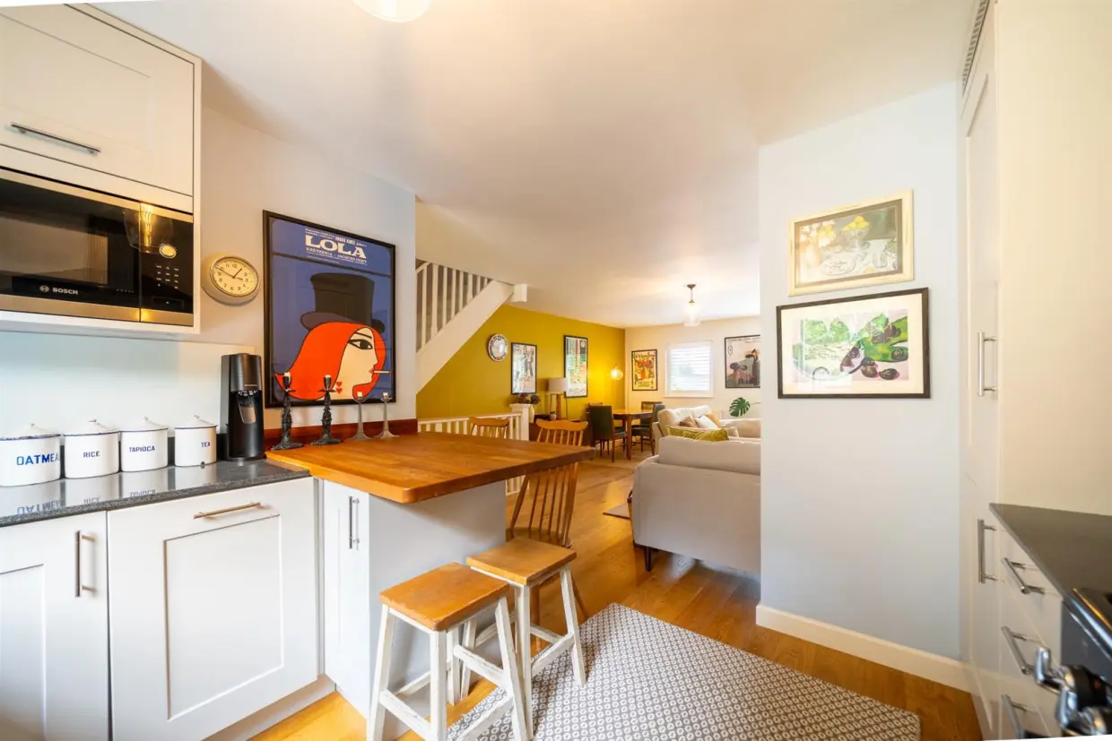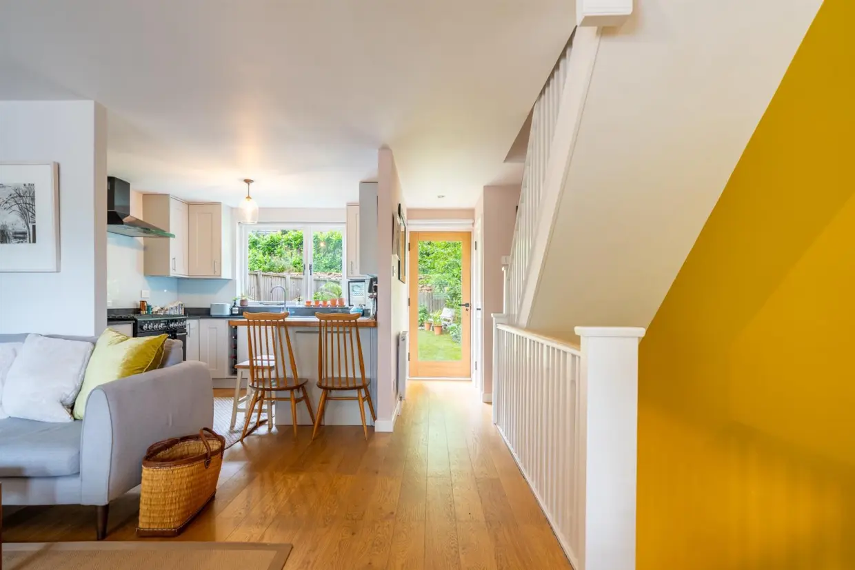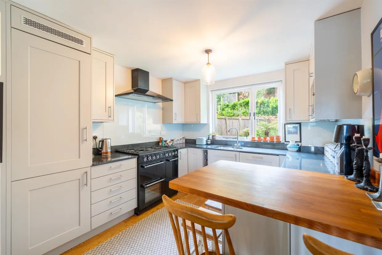 The first floor offers a stunning open-plan lounge and kitchen area, fitted with a range of classic units and appliances. A built-in storage cupboard enhances practicality, while a glazed door opens directly onto the easy-maintenance rear garden-perfect for entertaining or relaxing outdoors.