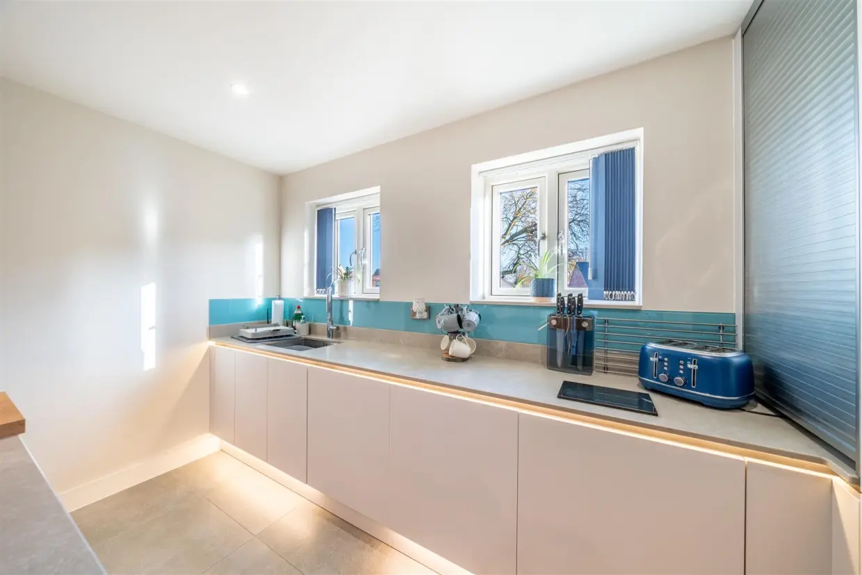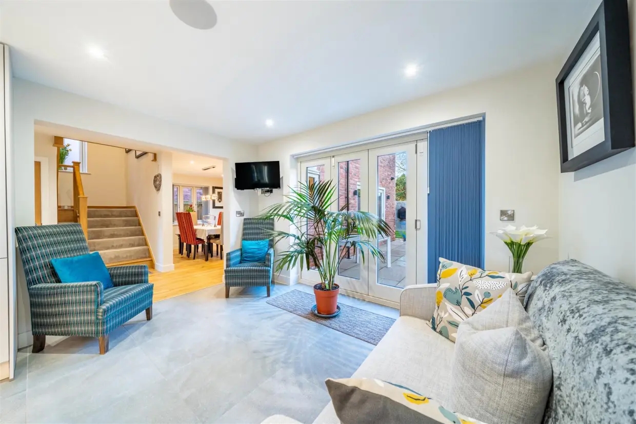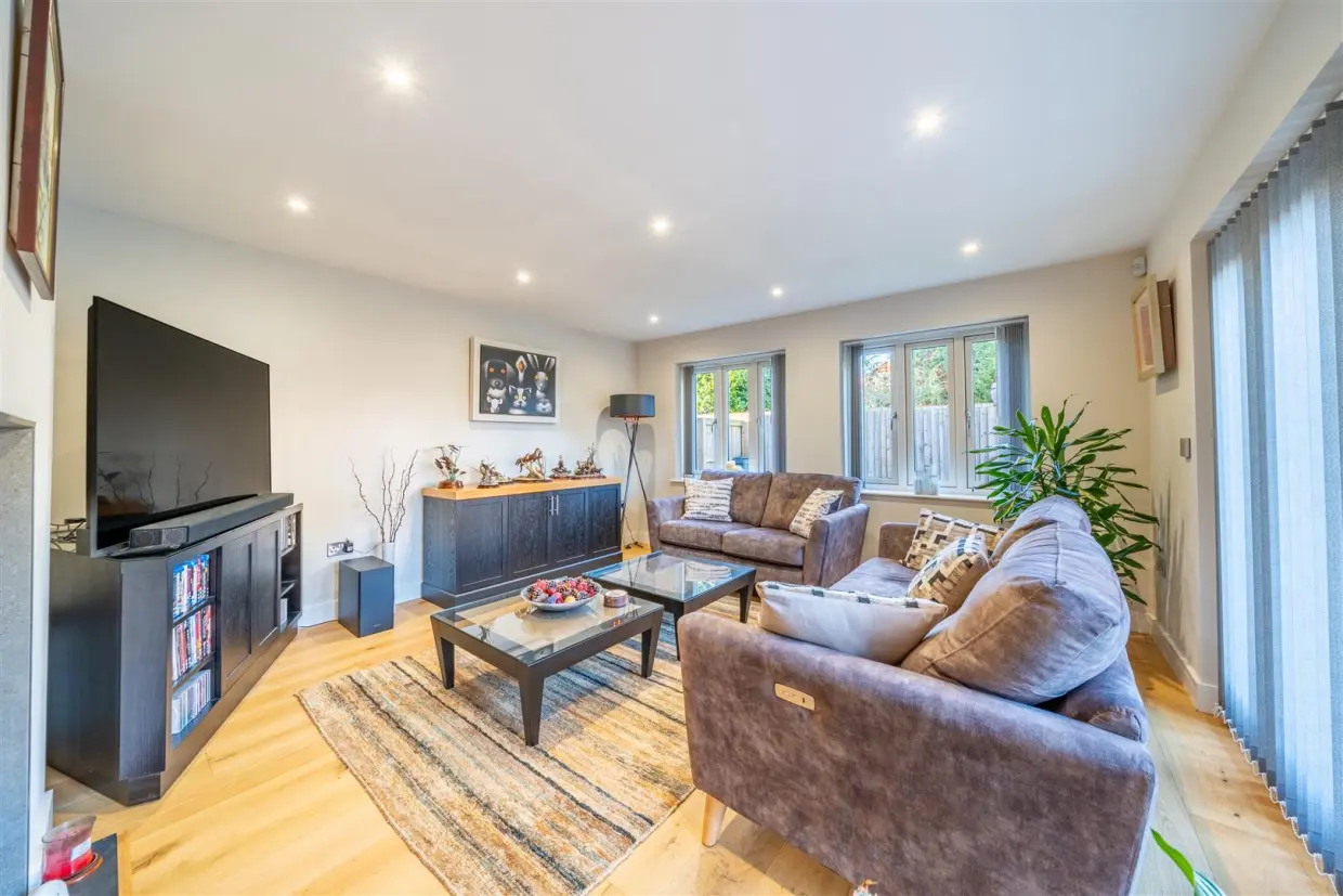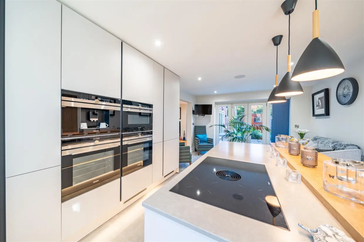 Seamlessly connected, the stunning contemporary kitchen–family room boasts sleek wall and base cabinetry, high-quality integrated appliances and a stylish breakfast bar set against the central island, an entertainer's dream, with French doors extending the living space outdoors. A handy utility room sits just off the kitchen, complete with sink, laundry space and a second door to the garden, plus access to a guest WC and the integrated double garage.