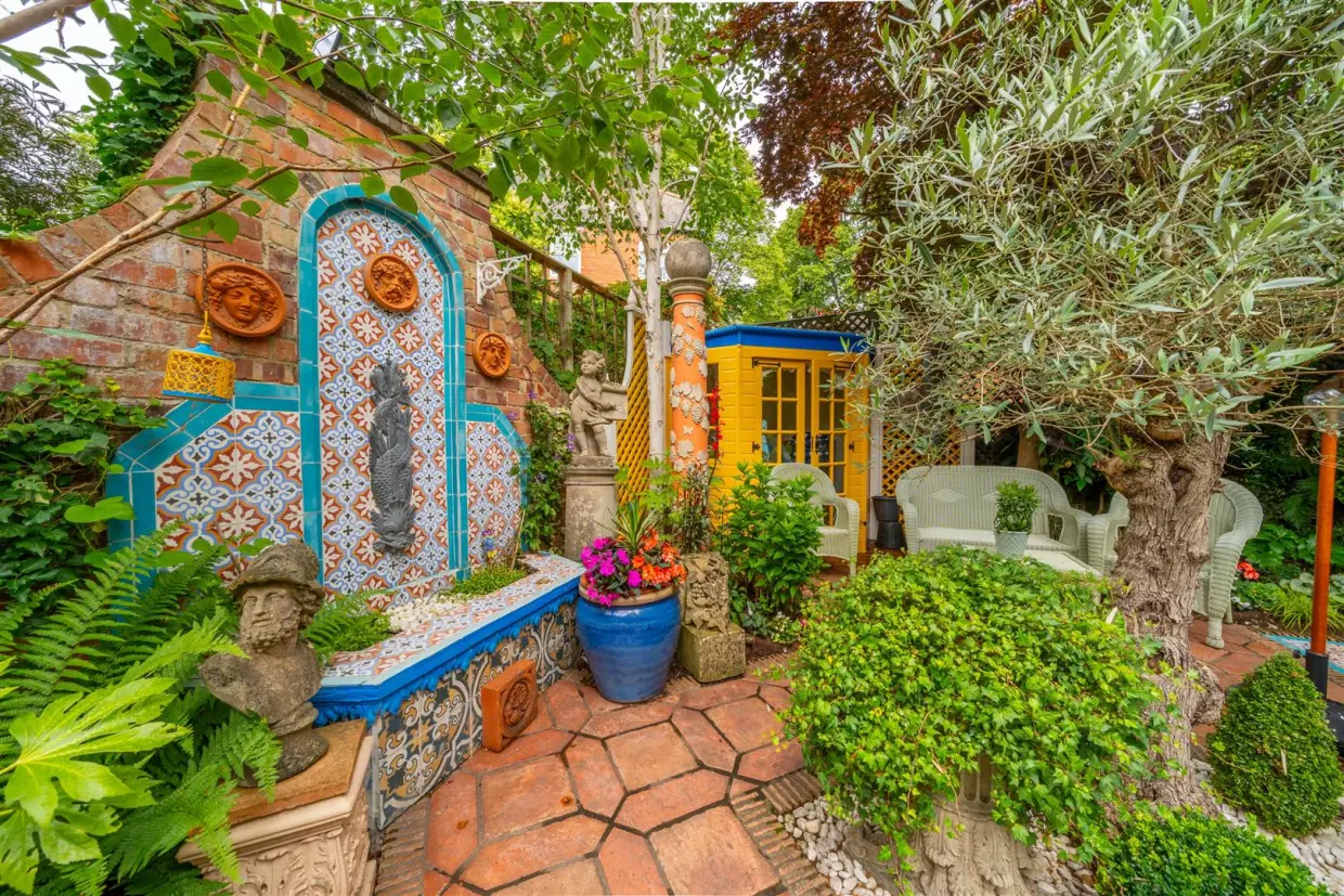 - Gated off-road parking / Courtyard-style rear garden with paths, seating & lush greenery