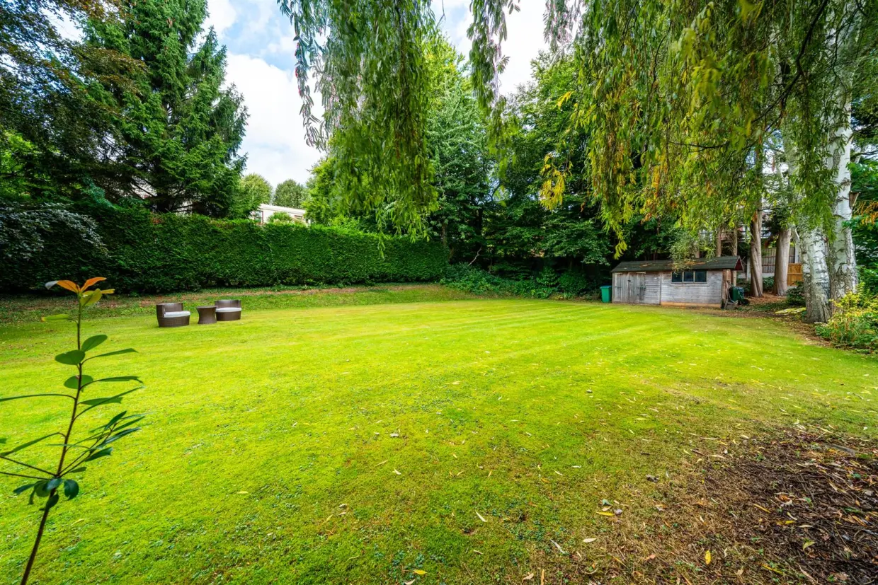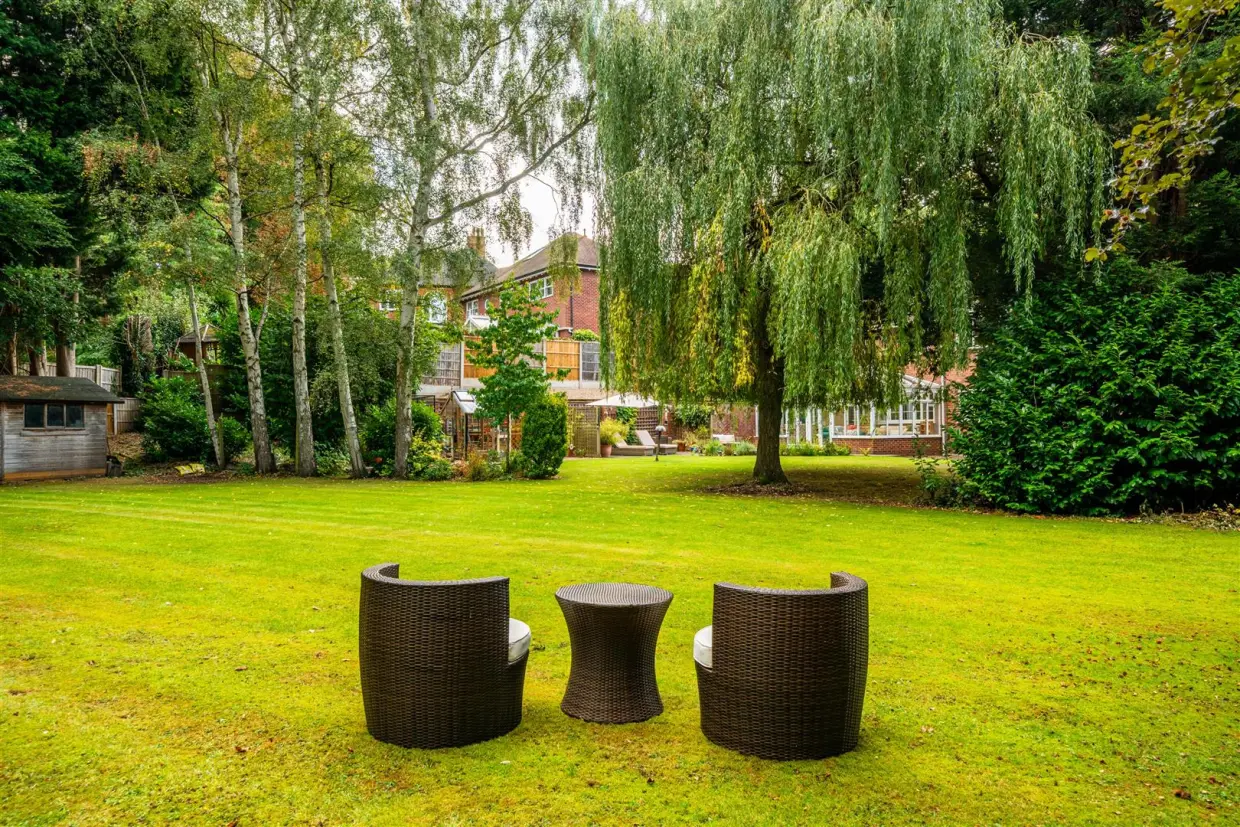 - Mature landscaped frontage with twin driveways and a private rear garden with sweeping lawn, trees,
