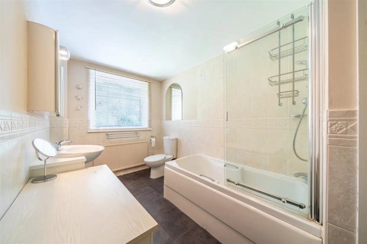 Upstairs, the first floor accommodates four spacious double bedrooms, each with wardrobes. The master bedroom benefits from an en-suite bathroom including both a bath and separate shower, while the additional family bathroom is fitted with a modern suite.