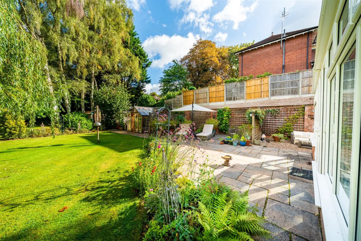 Outside, the property is set back from the road behind a mature landscaped frontage with twin driveways, offering ample off-road parking. To the rear, a beautifully maintained garden with established trees, shrubs, and a sweeping lawn creates a private and picturesque backdrop for family life and entertaining.