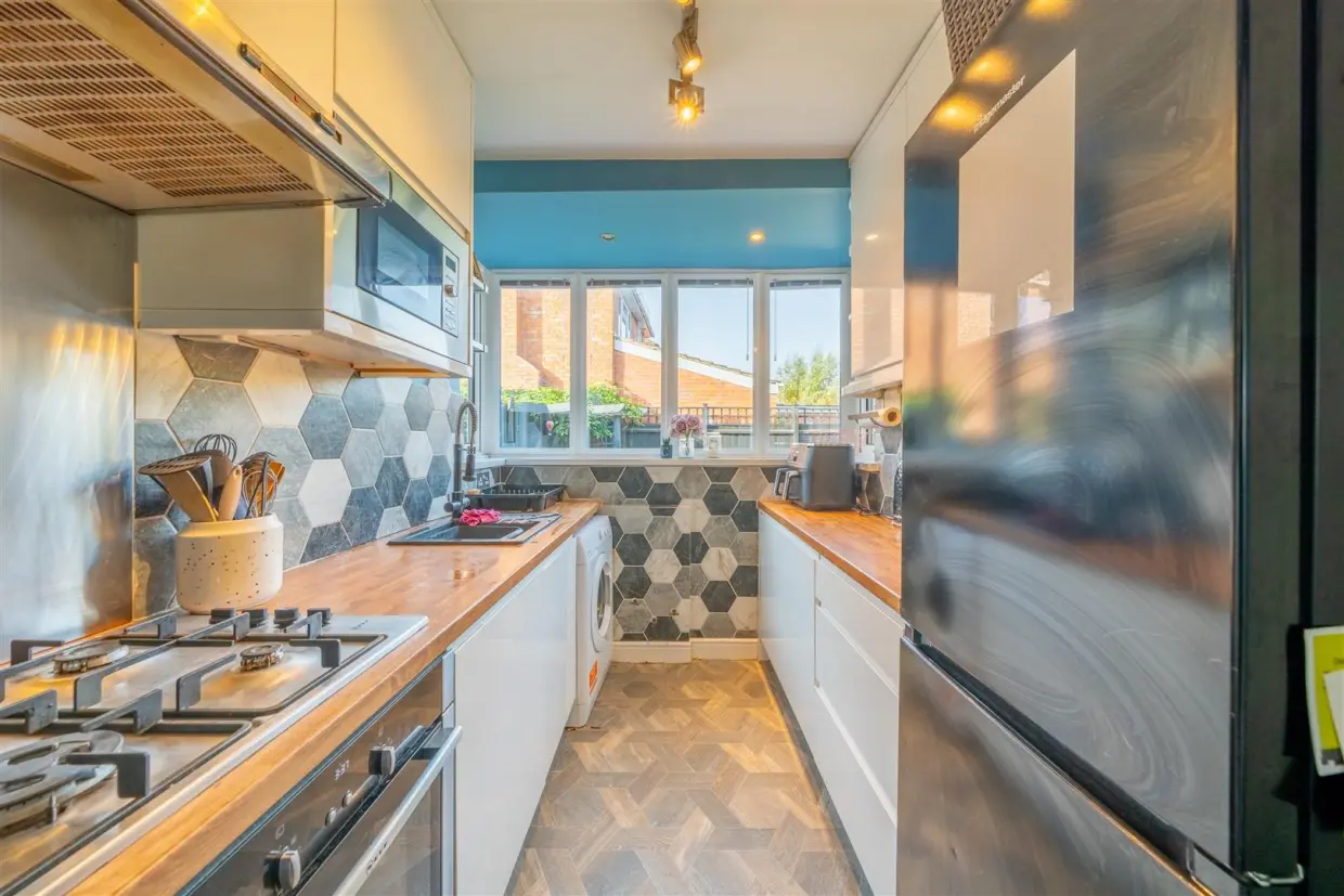 The kitchen is fitted with a contemporary range of wall and base units, incorporating an integrated oven, hob, extractor, and microwave, with space for a fridge and washing machine. A double box bay window enjoys views over the rear garden. A door provides access to the generous garage, which benefits from a roller door, built-in storage units, a workshop area, and further access to the rear garden.
