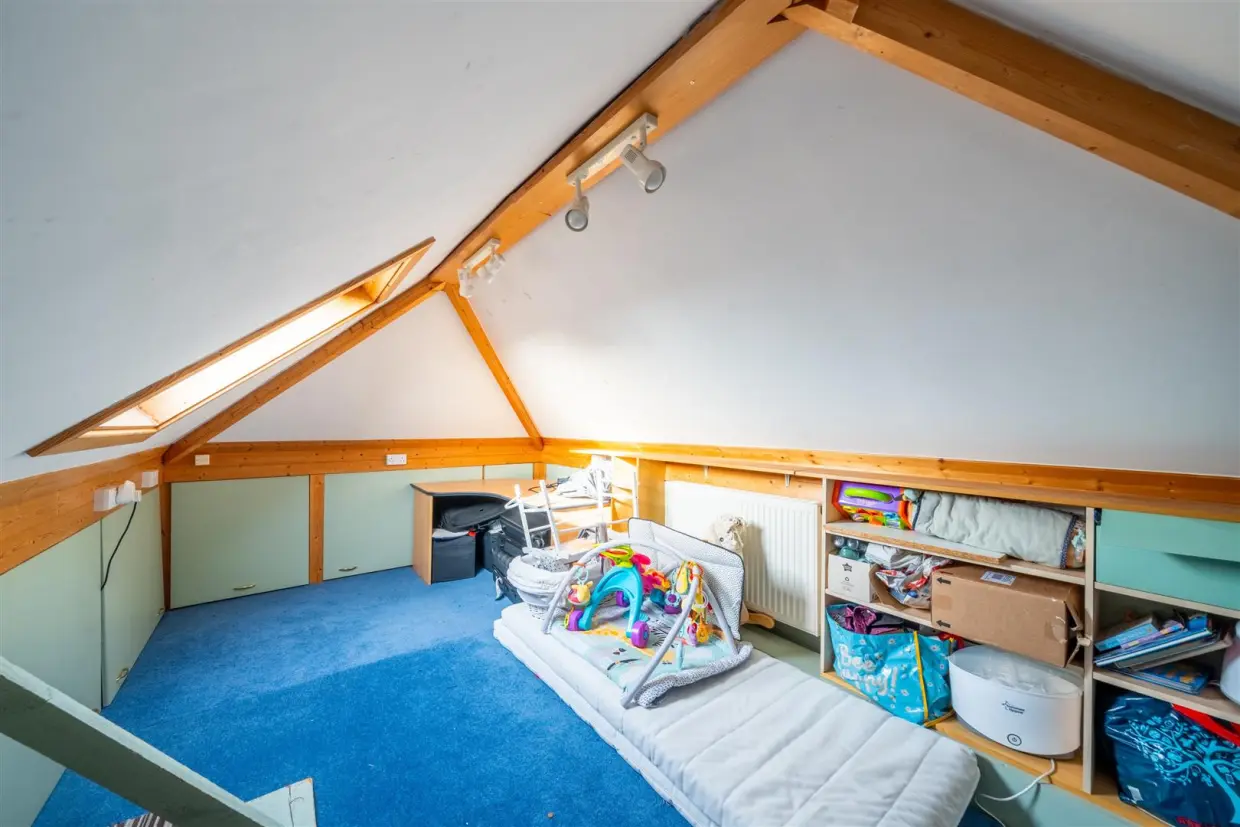 The loft has been partially converted, with Velux-style windows providing natural light. This space offers excellent storage and could serve as an occasional office or guest bedroom.
