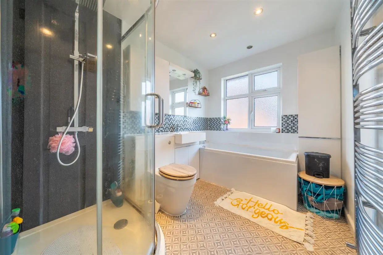 To the first floor, there are three bedrooms, two doubles and a single, together with a modern four-piece family bathroom, featuring tiled floors, part-tiled walls, and a chrome towel radiator.