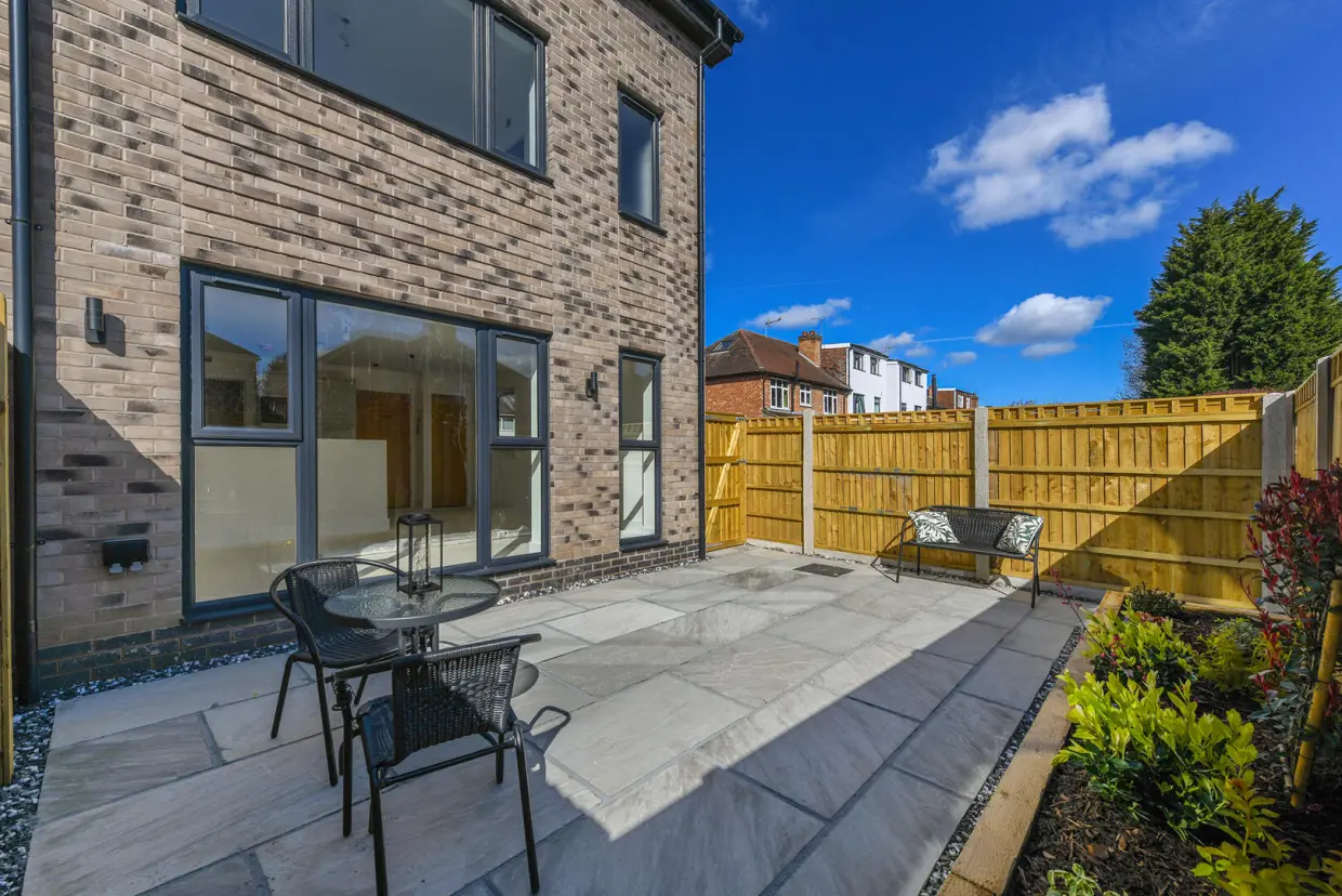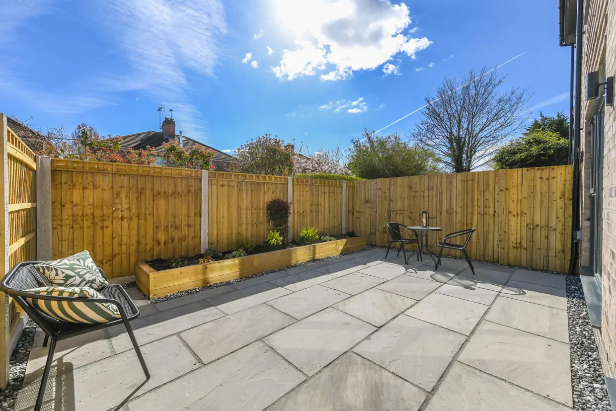 - Landscaped gardens with raised planters, porcelain tiled patios, full-height fencing/walls & gated a